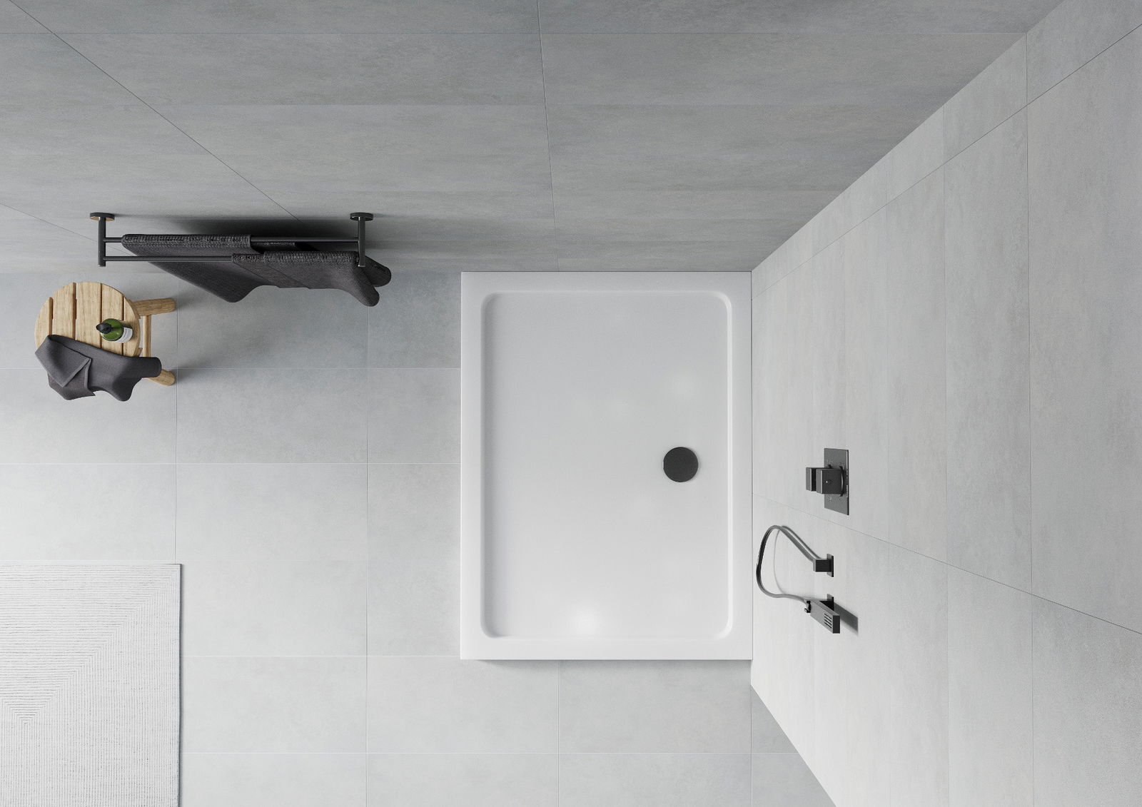 The shower tray is designed in such a way that water can freely flow towards the drain. It ensures quick and effective drainage of water from the surface of the shower tray, preventing the formation of puddles and flooding the bathroom.