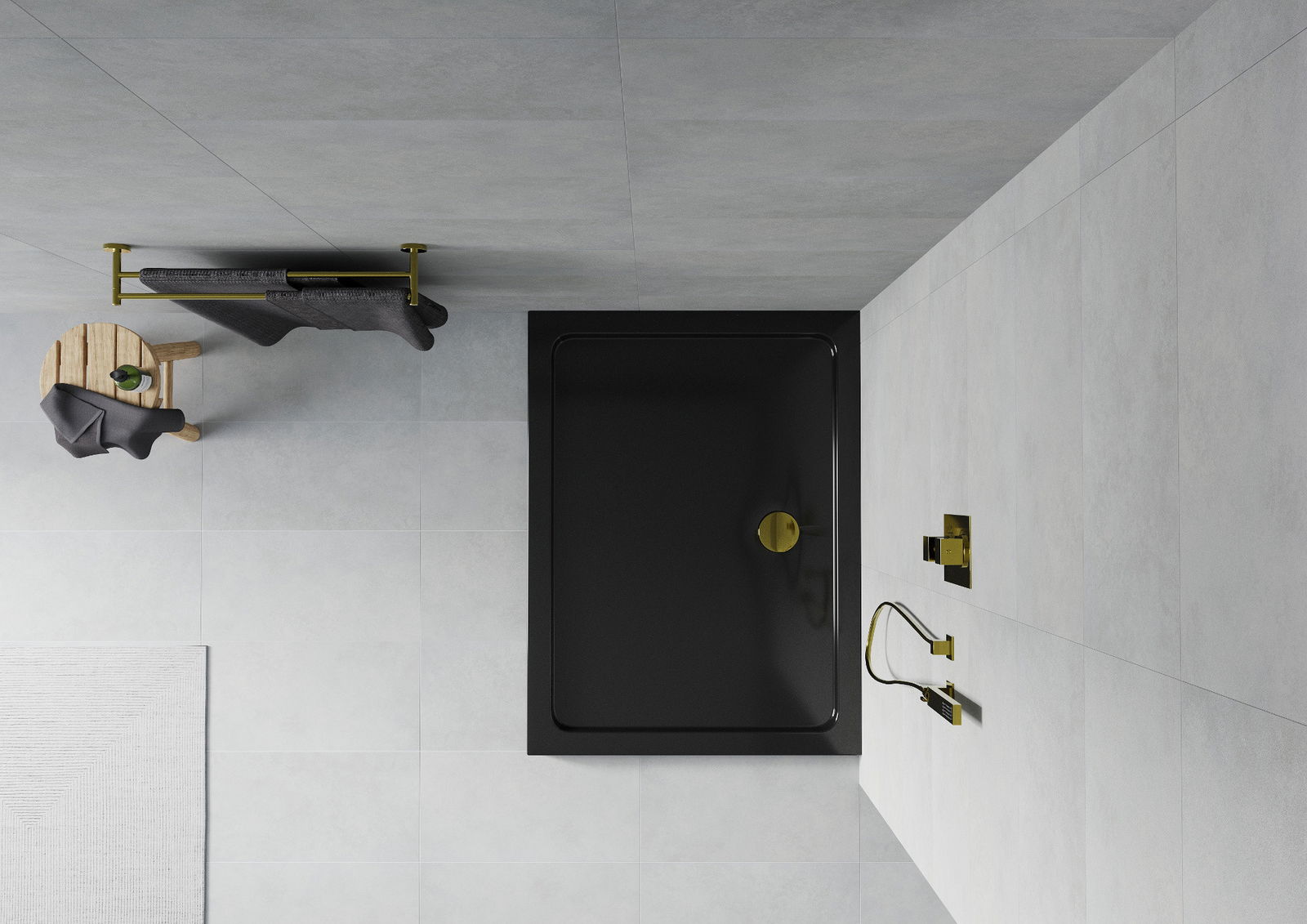 Mexen Flat rectangular slim shower tray 90 x 70 cm, black, gold siphon - 40707090G