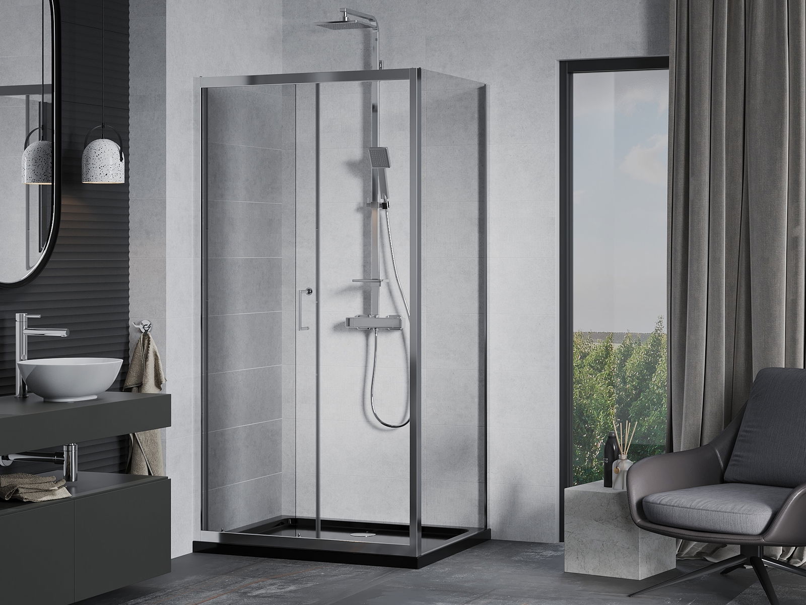 Mexen Apia sliding shower enclosure 90 x 70 cm, transparent, chrome + Flat tray, black - 840-090-070-01-00-4070