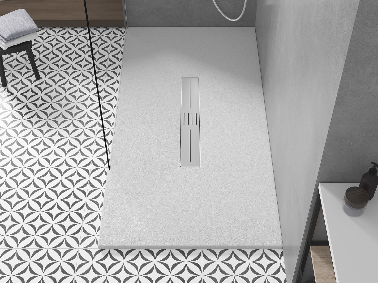 The surface of the shower tray resembles a stone with its structure. It is a unique combination of natural appearance with a modern interior arrangement. It adds character, emphasizes the aesthetics and elegance of the bathroom decor and impresses with its form.