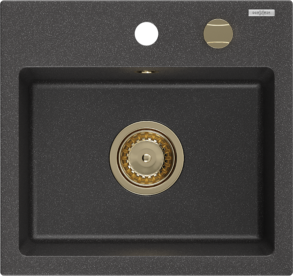 Mexen Milo granite sink 1-bowl 435 x 410 mm, black speckled, golden siphon - 6505441000-76-G