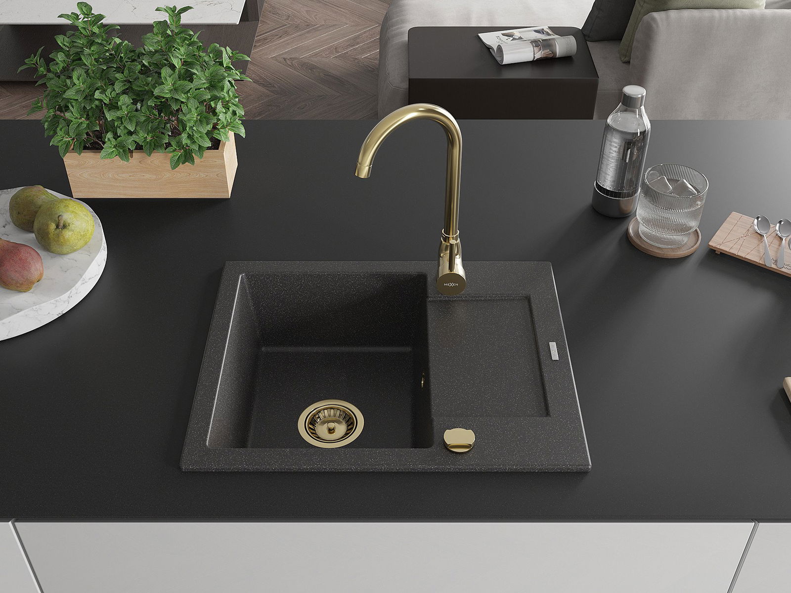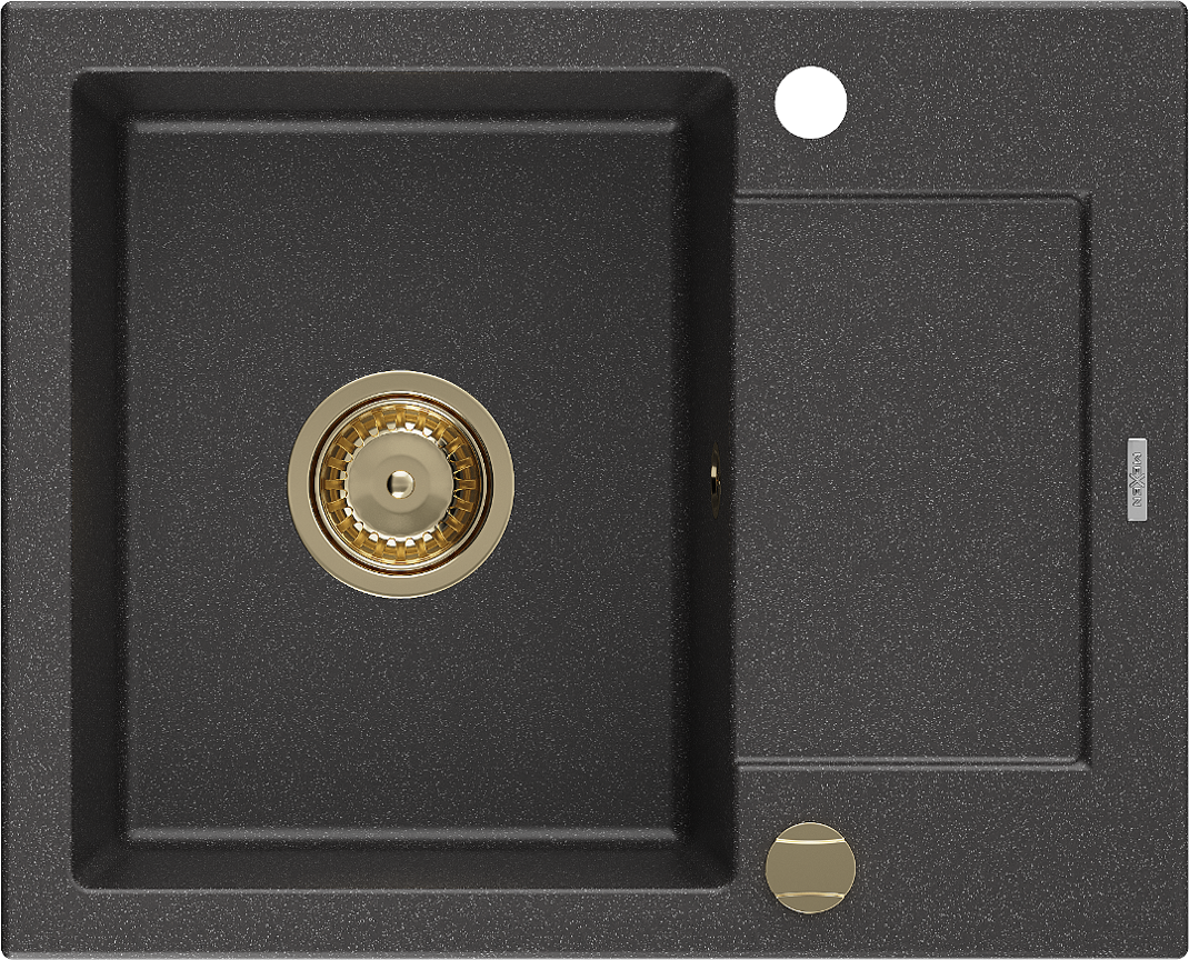 Mexen Enzo 1-bowl granite sink with drainer 576 x 465 mm, black speckled, gold siphon - 6506571005-76-G
