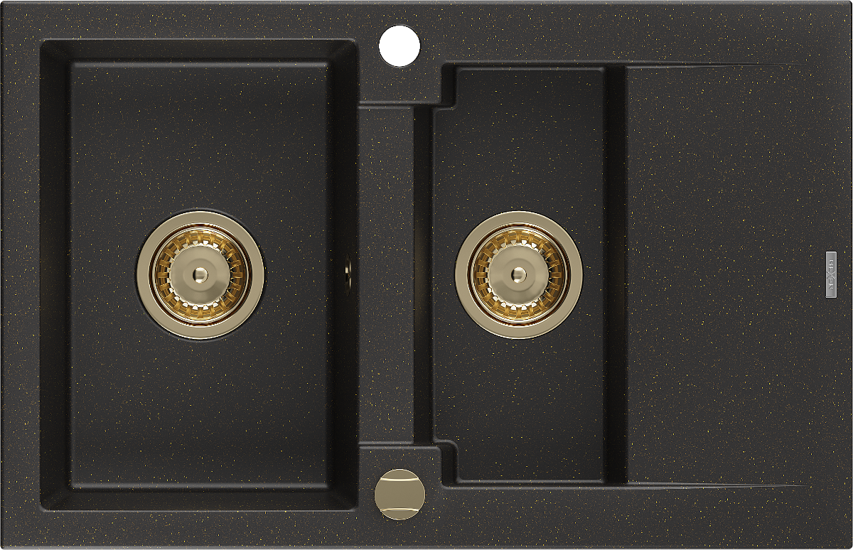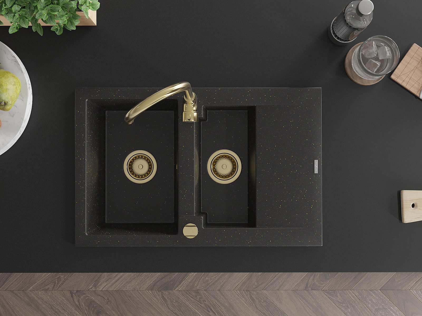 Mexen Gaspar granite sink 1.5-bowl with drainer 737 x 475 mm, black/gold metallic, gold siphon - 6507731505-75-G