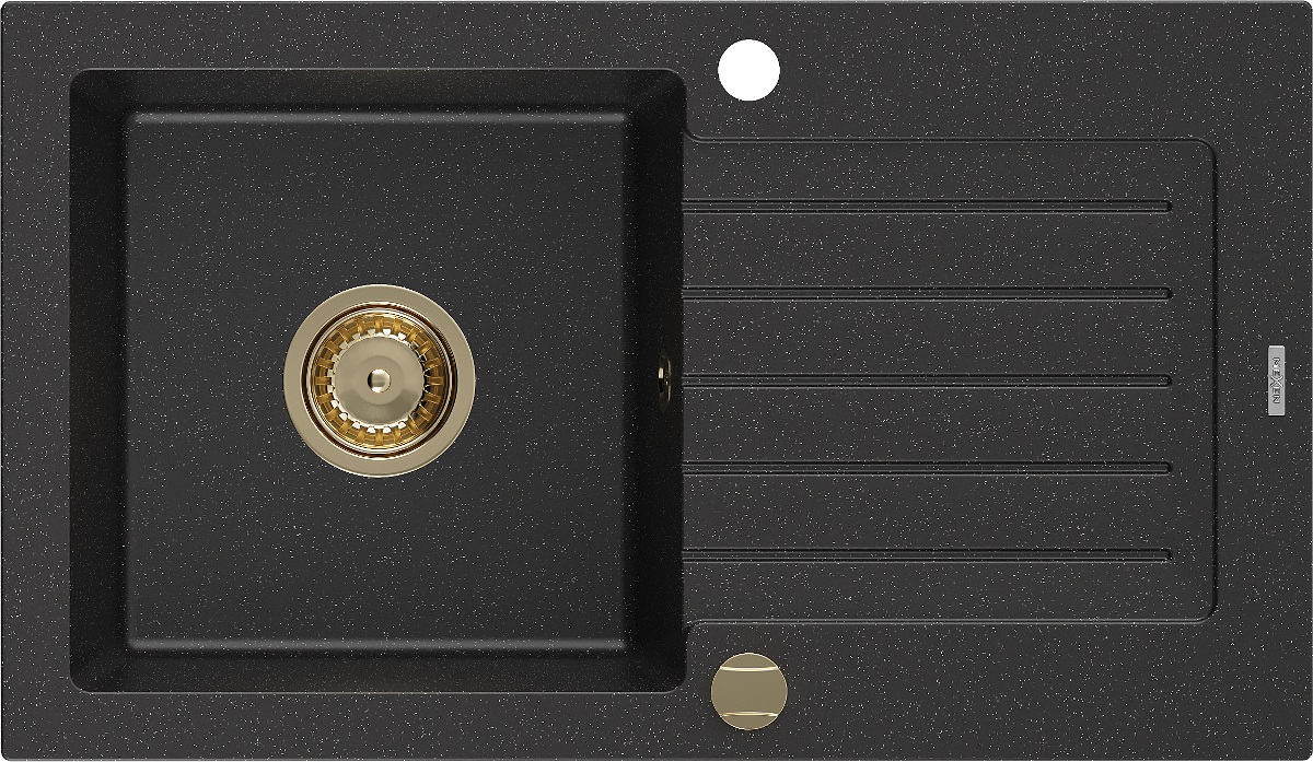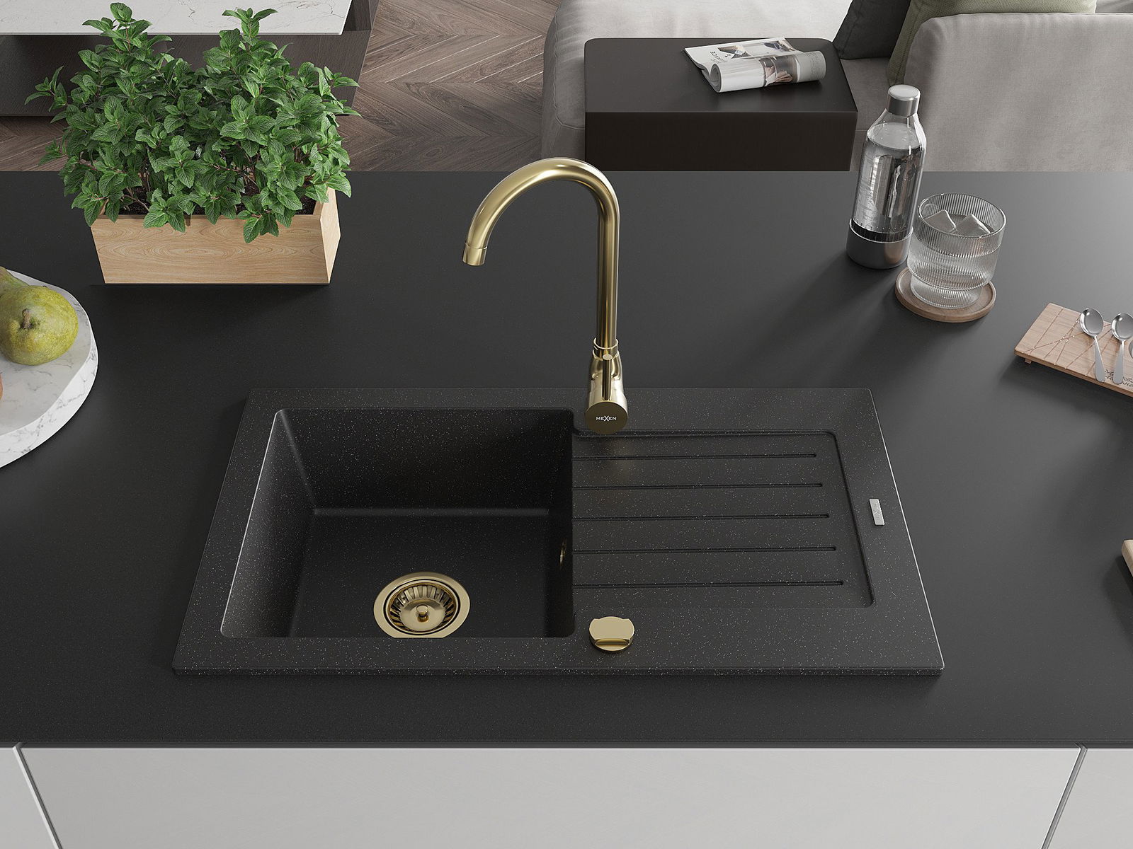 Mexen Pablo 1-bowl granite sink with drainer 752 x 436 mm, black/silver metallic, gold siphon - 6510751010-73-G