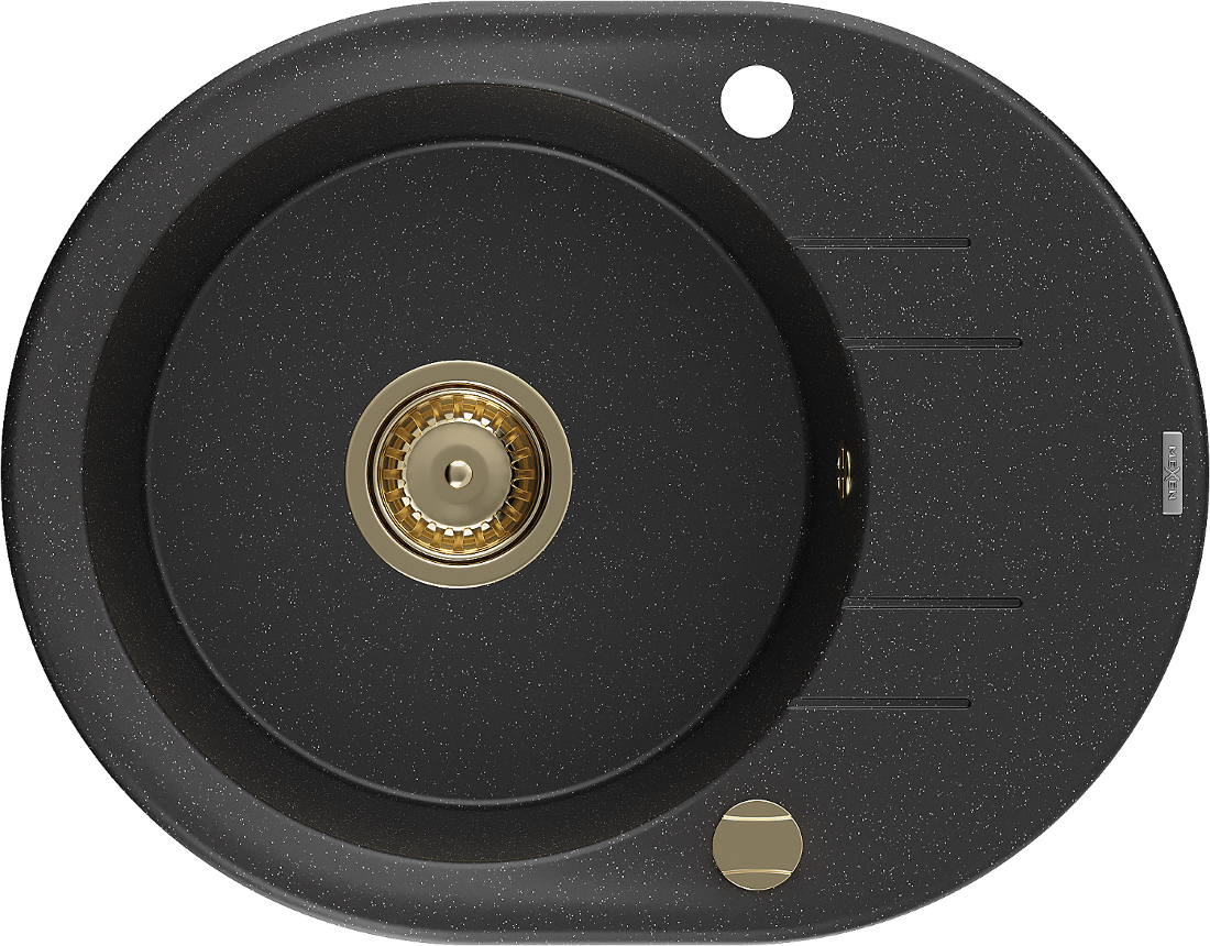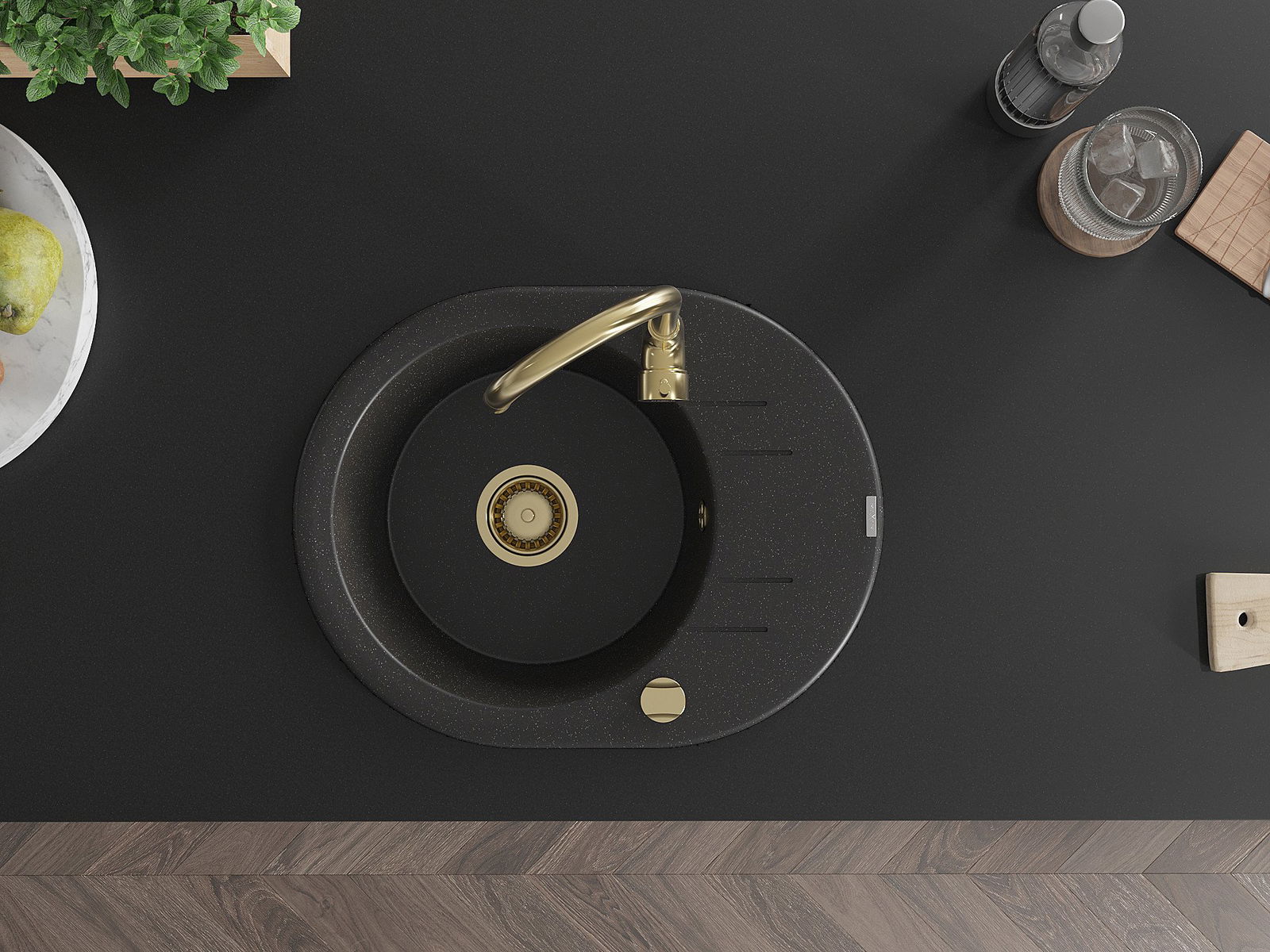 Mexen Kevin 1-bowl granite sink with drainer 586 x 458 mm, black/silver metallic, golden siphon - 6517581005-73-G