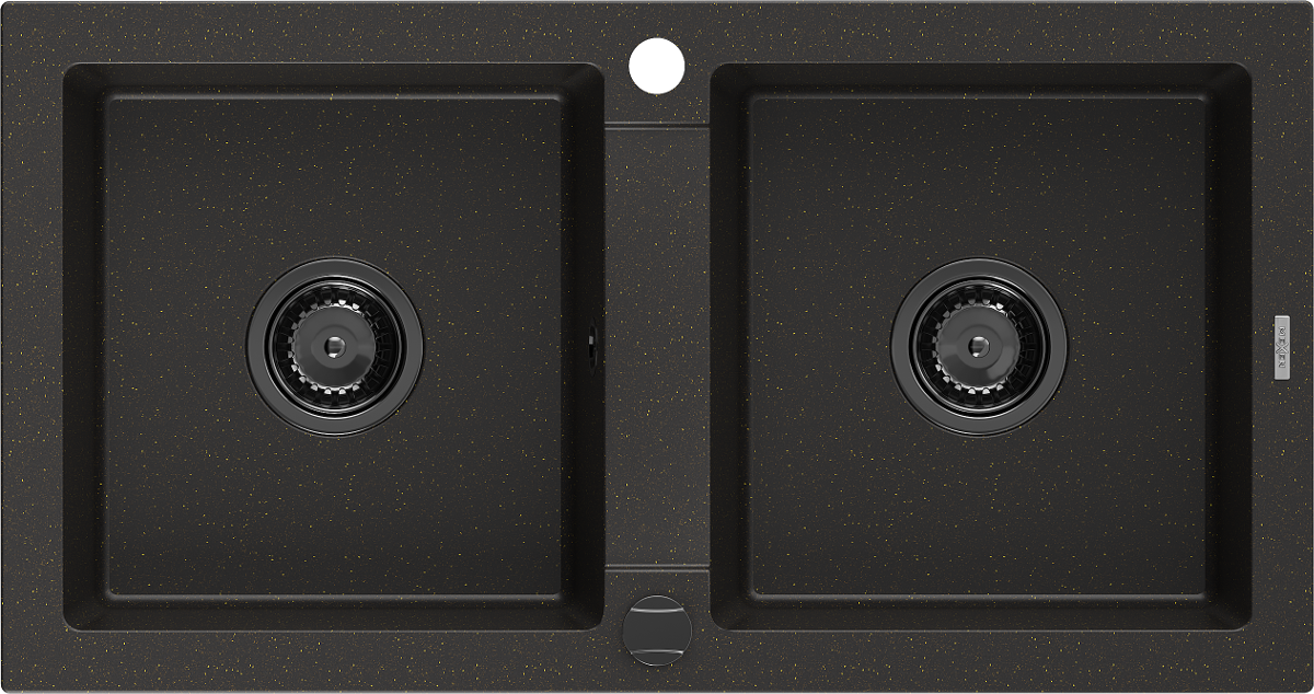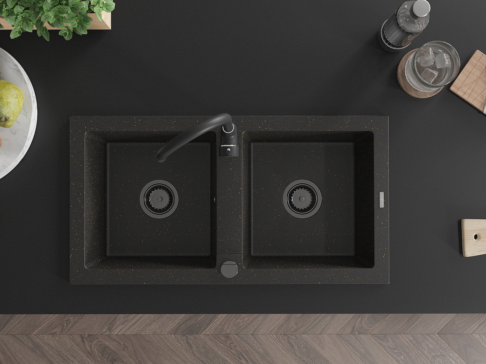 Mexen Mario granite sink 2-bowl 820 x 436 mm, black/gold metallic, black siphon - 6504822000-75-B