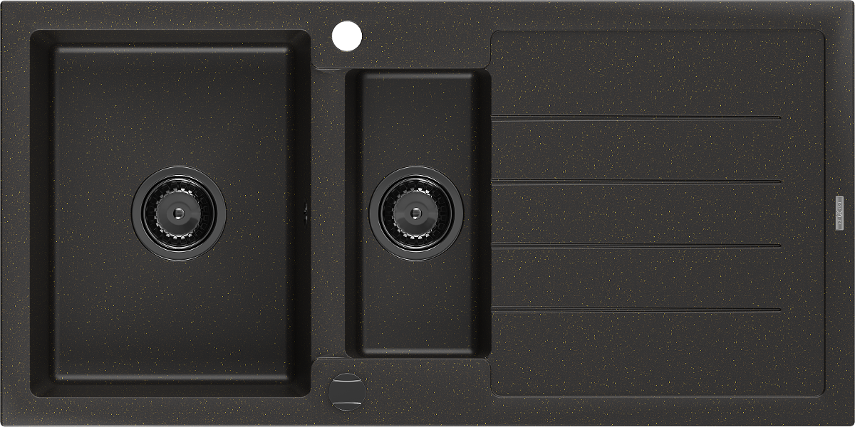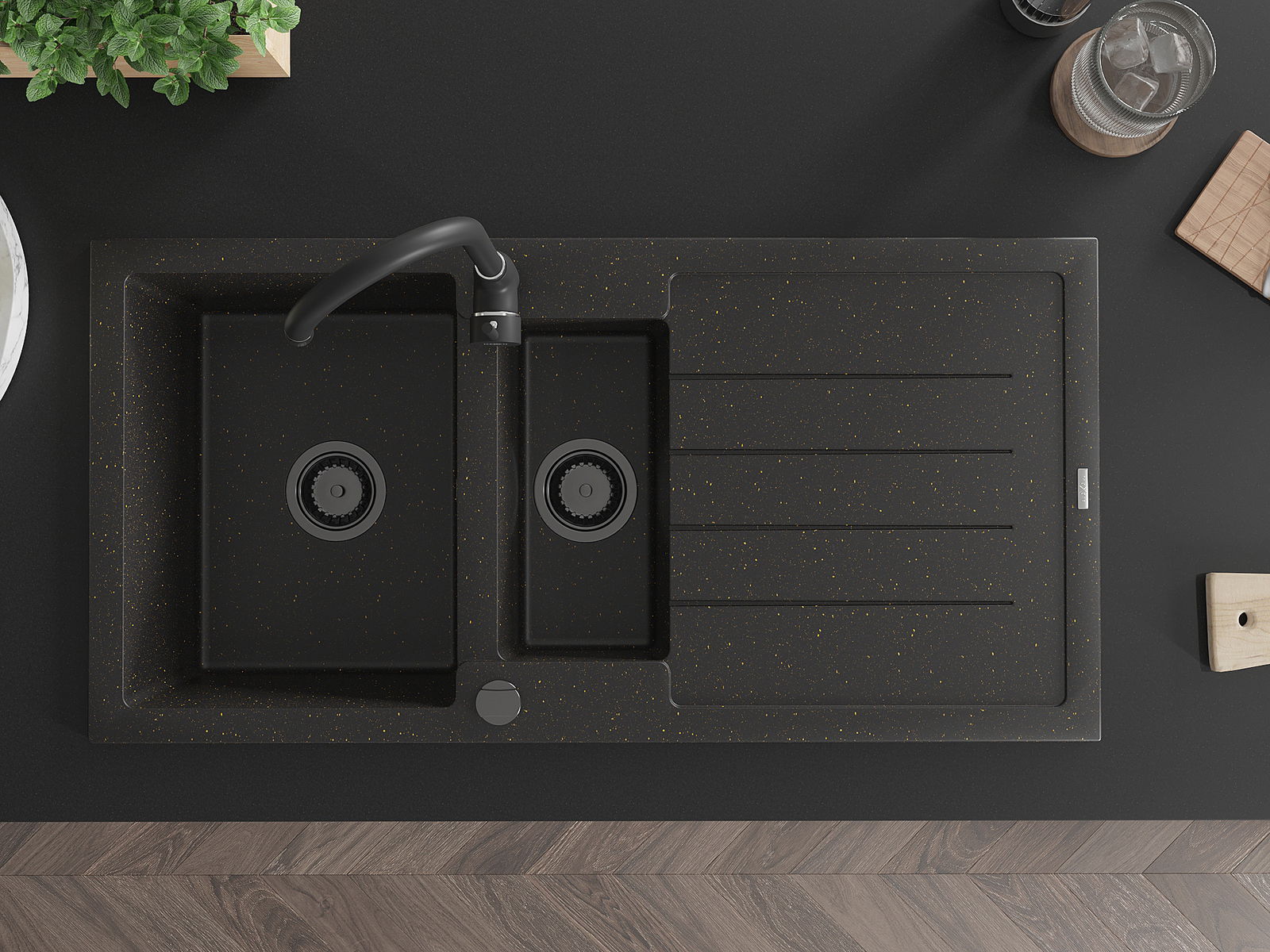Mexen Andres 1.5-bowl granite sink with drainer 1000 x 500 mm black/gold metallic, black siphon - 6515101510-75-B