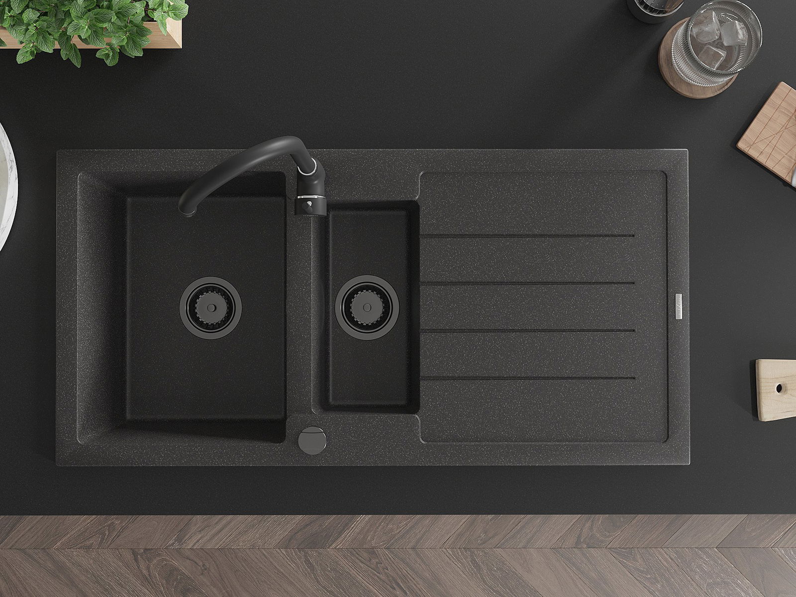 Mexen Andres granite sink 1.5-bowl with drainer 1000 x 500 mm black speckled, black siphon - 6515101510-76-B