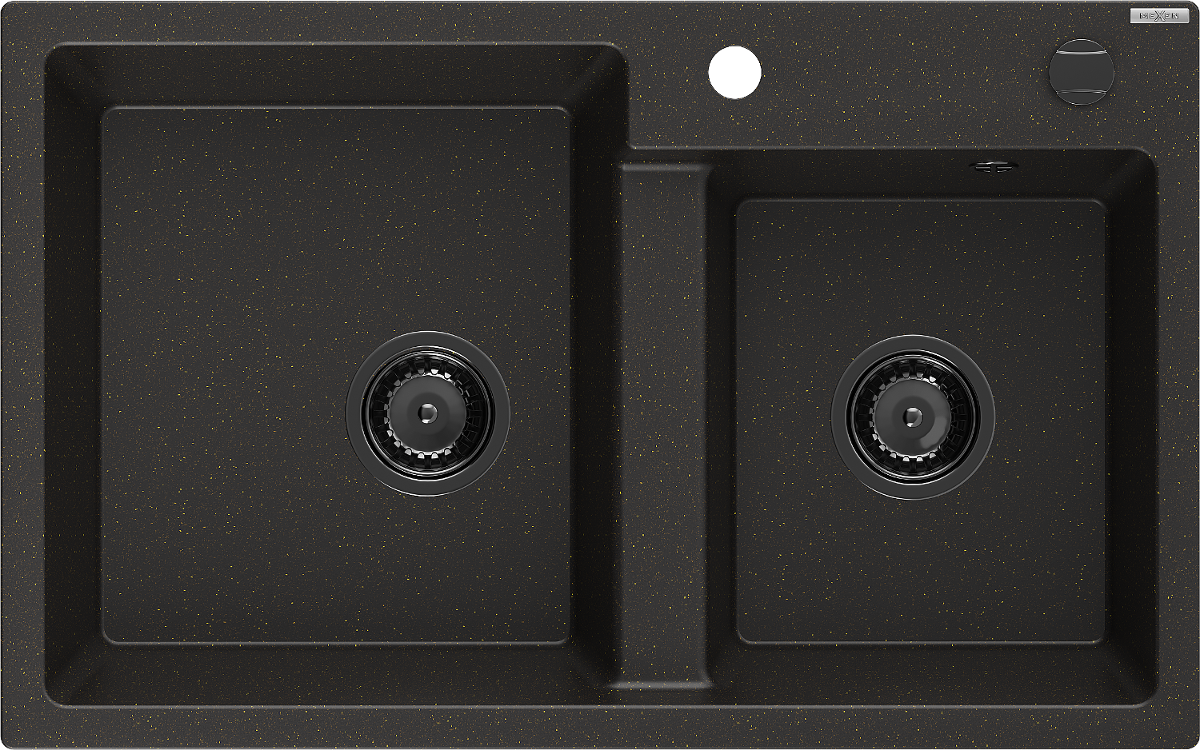 Mexen Tomas granite sink 2-bowl 800 x 500 mm, black/gold metallic, black siphon - 6516802000-75-B