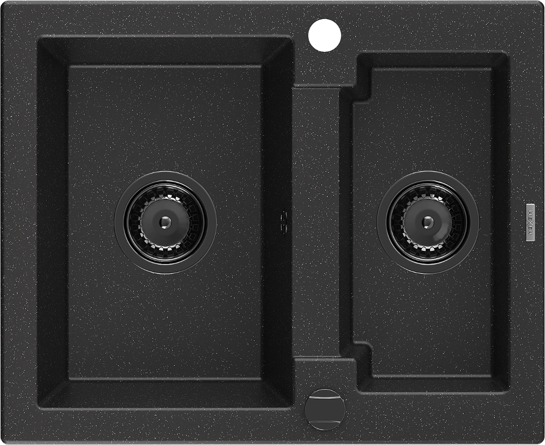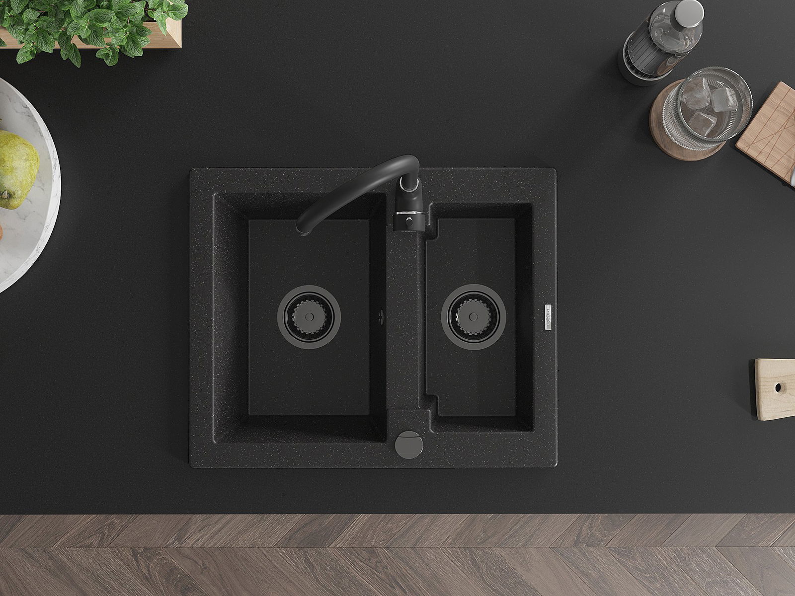 Mexen Carlos granite sink 1.5-bowl 582 x 475 mm, black/silver metallic, black siphon - 6518581500-73-B