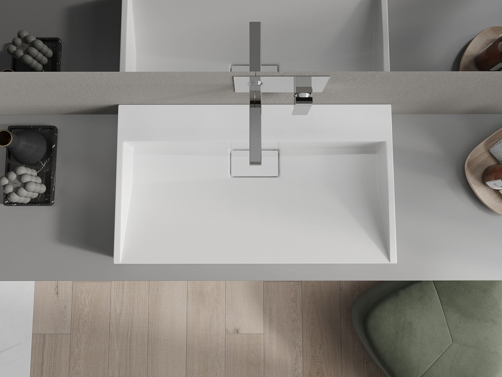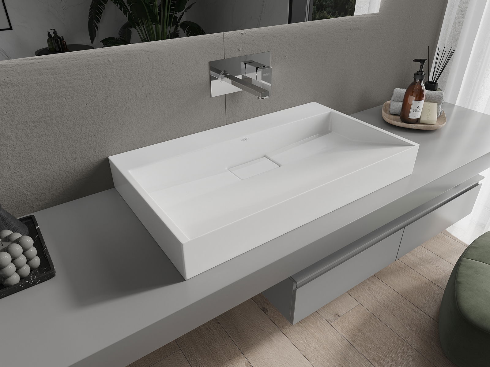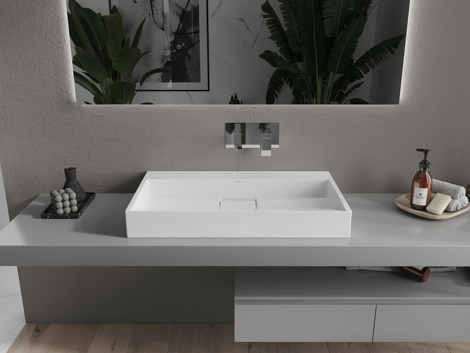 A countertop washbasin made of composite measuring 80 x 46 cm, in white, is an ideal solution for modern bathrooms. With its rectangular form and specialized construction, the product fits perfectly into design trends while offering functionality. The low height of 11 cm makes the washbasin convenient to use. The composite material ensures durability and ease of maintenance. The absence of tap holes allows for greater freedom in choosing fittings.