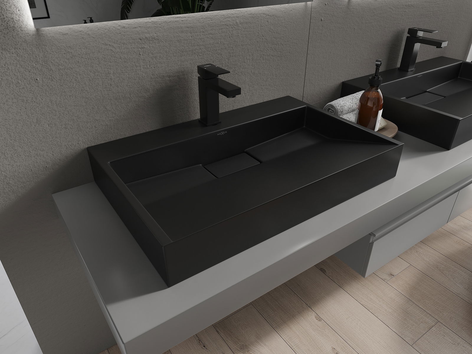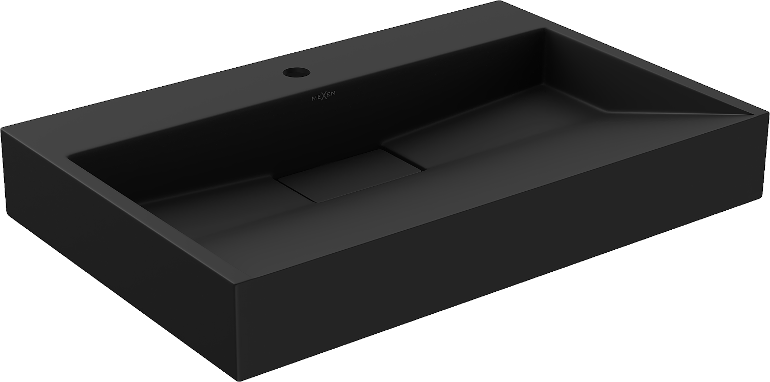 Mexen Ava is an elegant countertop basin made of black conglomerate, measuring 70x46x11 cm. It features a rectangular shape and glossy finish, adding a modern touch. The basin has a tap hole, ensuring easy installation. Thanks to its protective coating, it is easy to clean and resistant to damage. It blends perfectly in any bathroom, combining functionality with aesthetics.