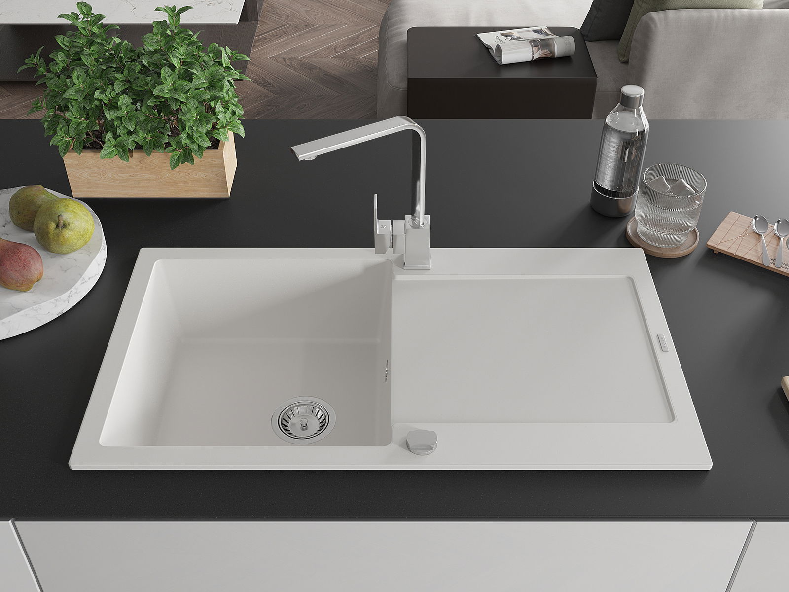 The sink is made of high quality granite. It is an elegant and, above all, practical complement to every kitchen, regardless of its style. High quality and granite durability ensure many years of use.