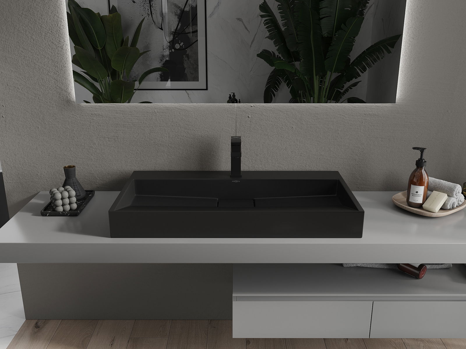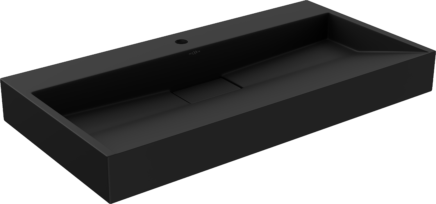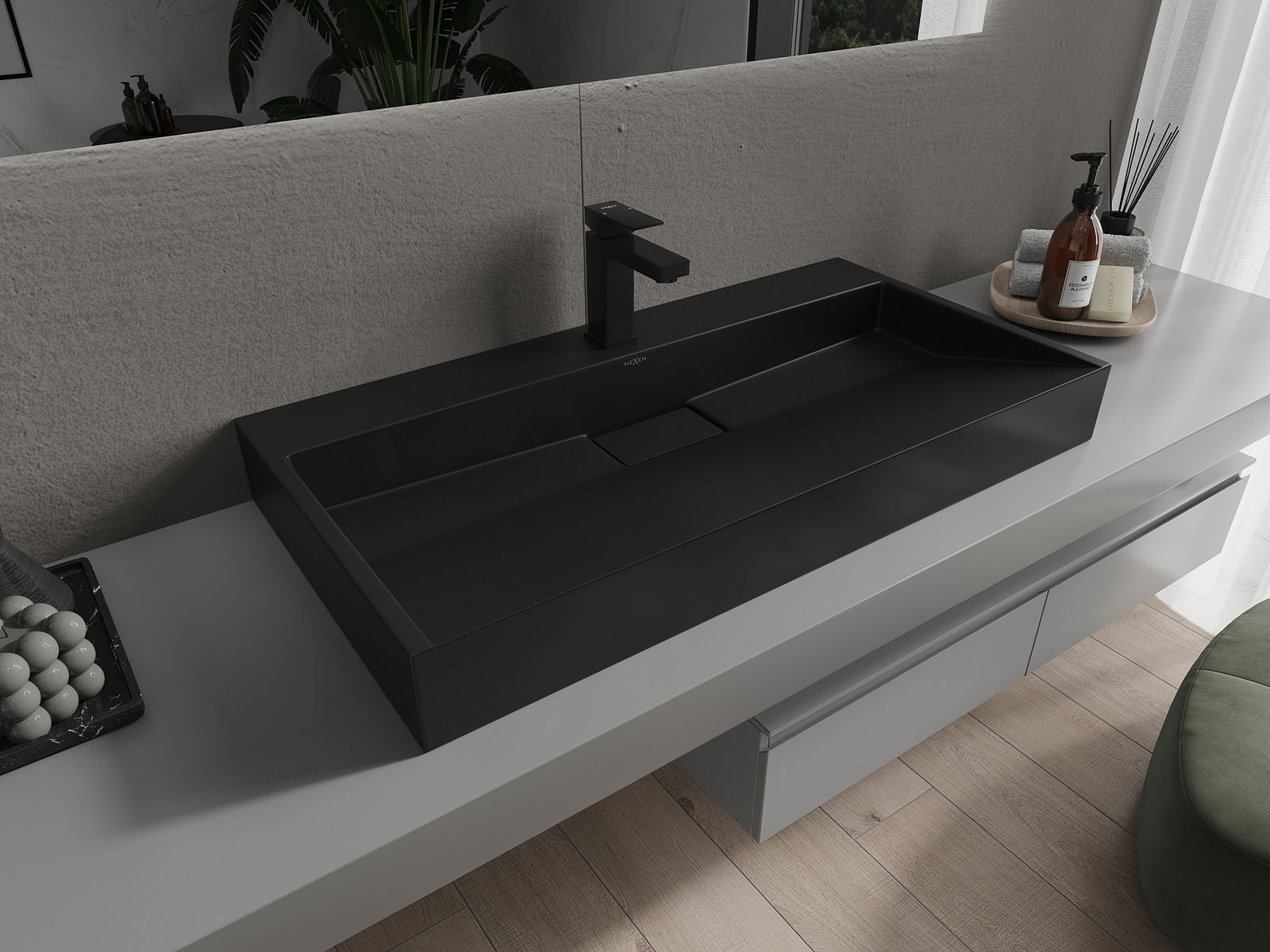 The Mexen Ava countertop basin is an excellent choice for modern bathrooms. Its rectangular design with dimensions of 90 x 46 cm and elegant black colour add sophistication to any interior. Made of conglomerate, it is not only aesthetic but also durable. The absence of an overflow hole and the presence of a tap hole ensure top functionality. Additionally, a protective coating makes it easy to keep clean. Ideal for those who value modern design and quality.
