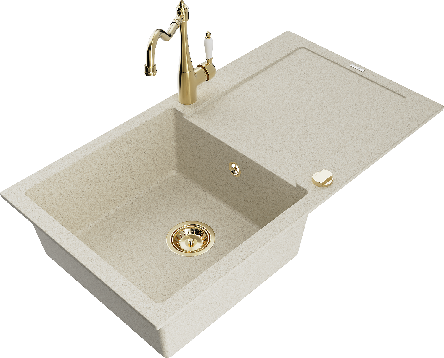Mexen Leo Granite Sink 1-Bowl with Drainer and Carla Kitchen Tap, Beige - 6501-69-670700-50