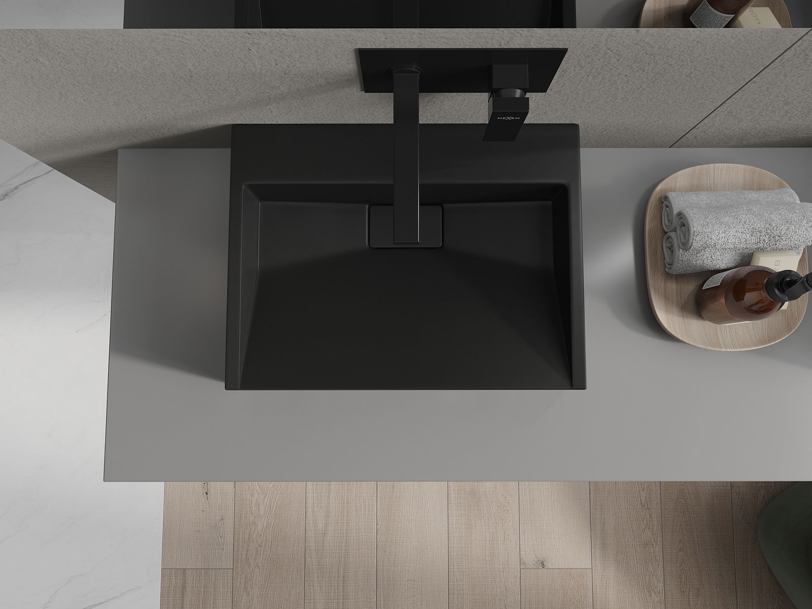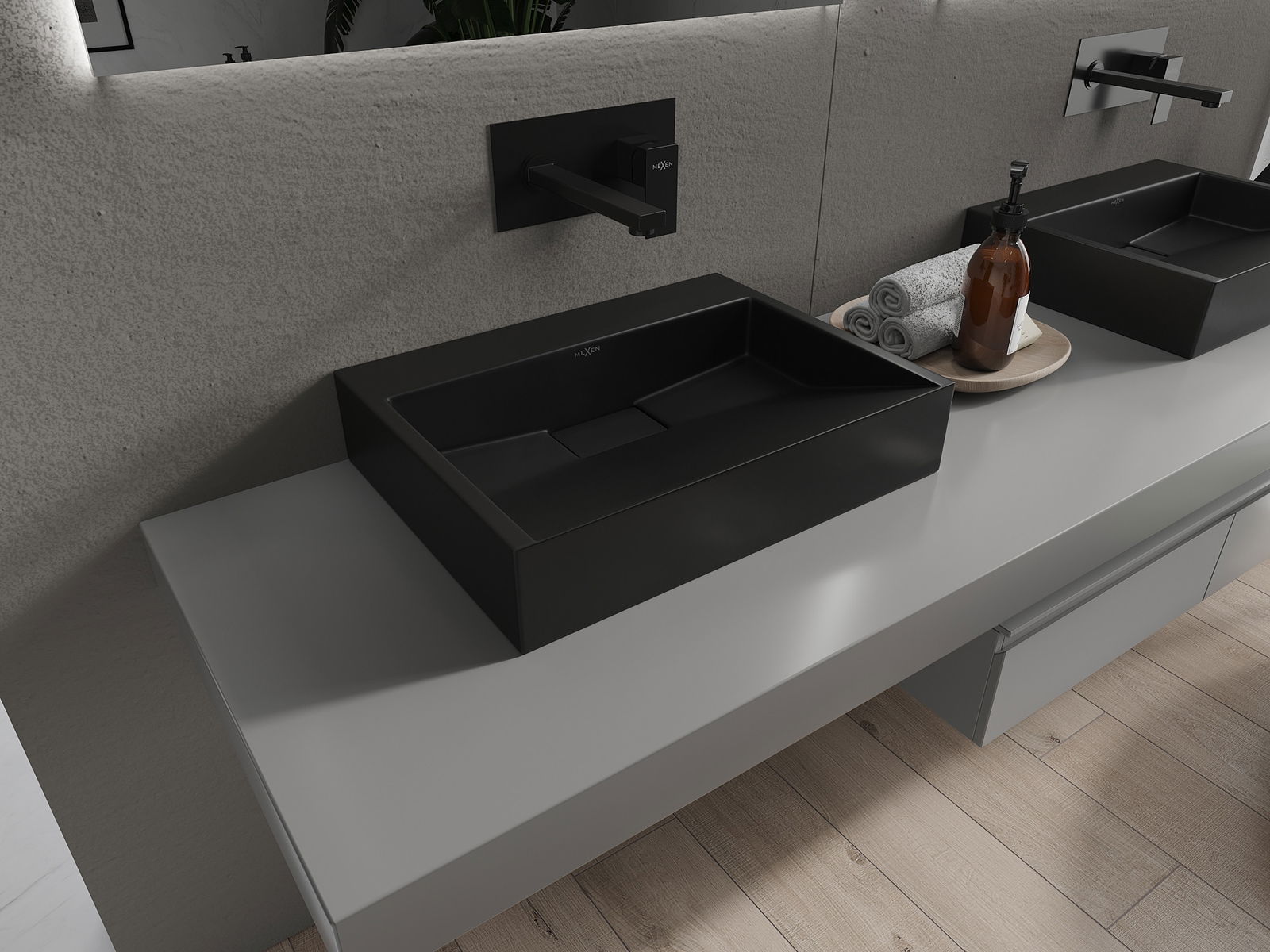 Mexen Ava is an elegant countertop washbasin with dimensions of 50x38 cm, made of high-quality conglomerate in stylish black. Thanks to the protective coating, it is resistant to damage, and its modern, rectangular shape fits perfectly into any interior. The basin has a depth of 8 cm and a height of 11 cm, providing functionality and comfort of use. Without tap holes and overflow, it offers a minimalist design, ideal for those valuing simplicity and elegance.