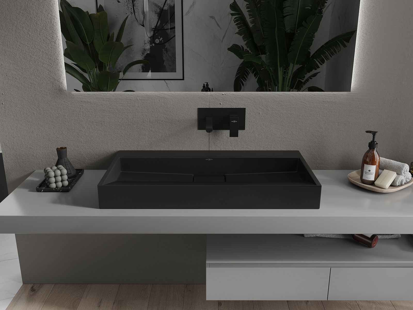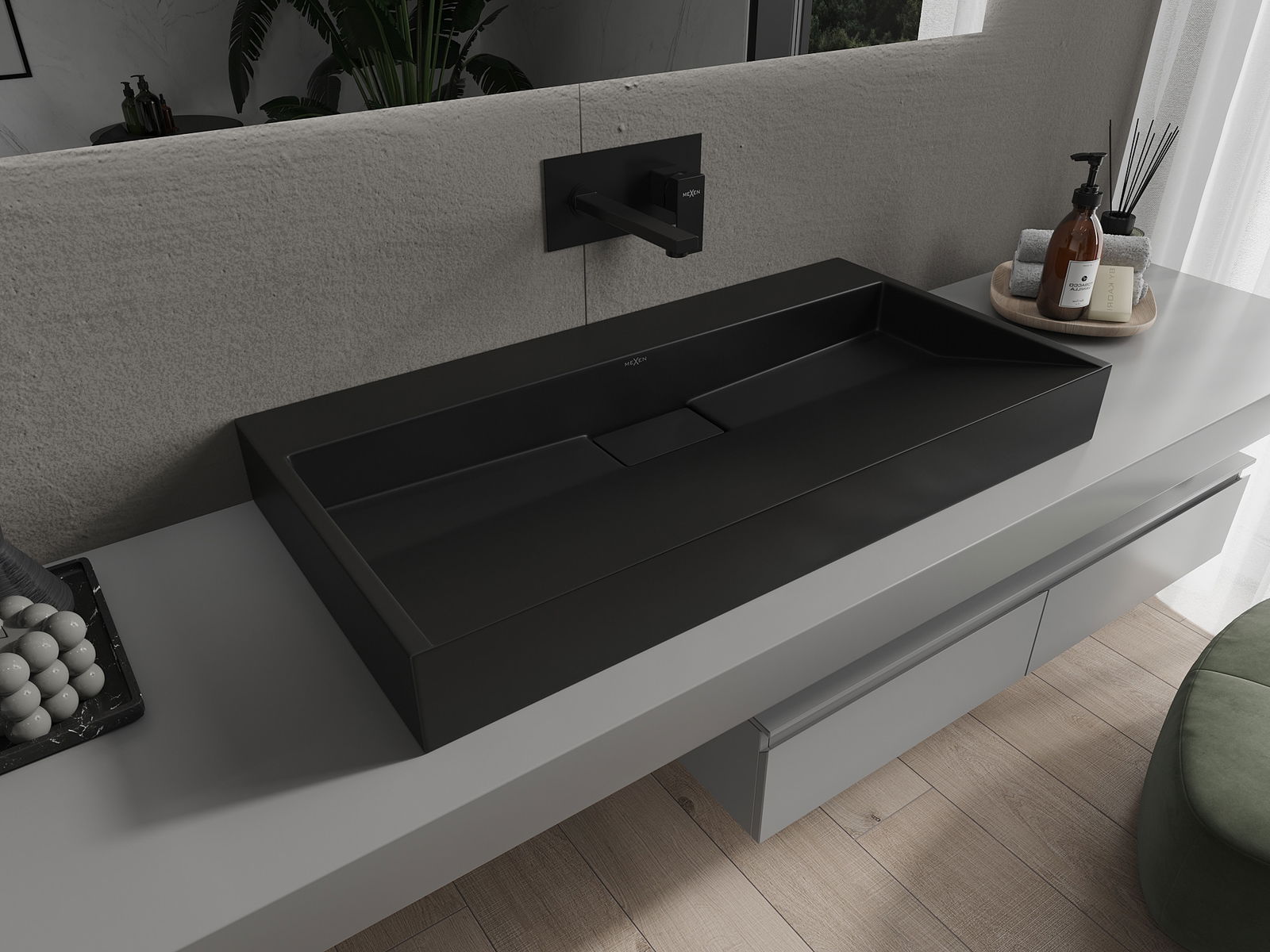 The Mexen Ava is an elegant countertop washbasin with dimensions of 90x46x11 cm, made from durable conglomerate in a classic black color. Its rectangular shape and polished surface make it a stylish addition to any bathroom. The basin does not have tap holes or an overflow, emphasizing its minimalist design. Additionally, the protective coating ensures easy cleaning and long-lasting use, making it an ideal solution for modern interiors.