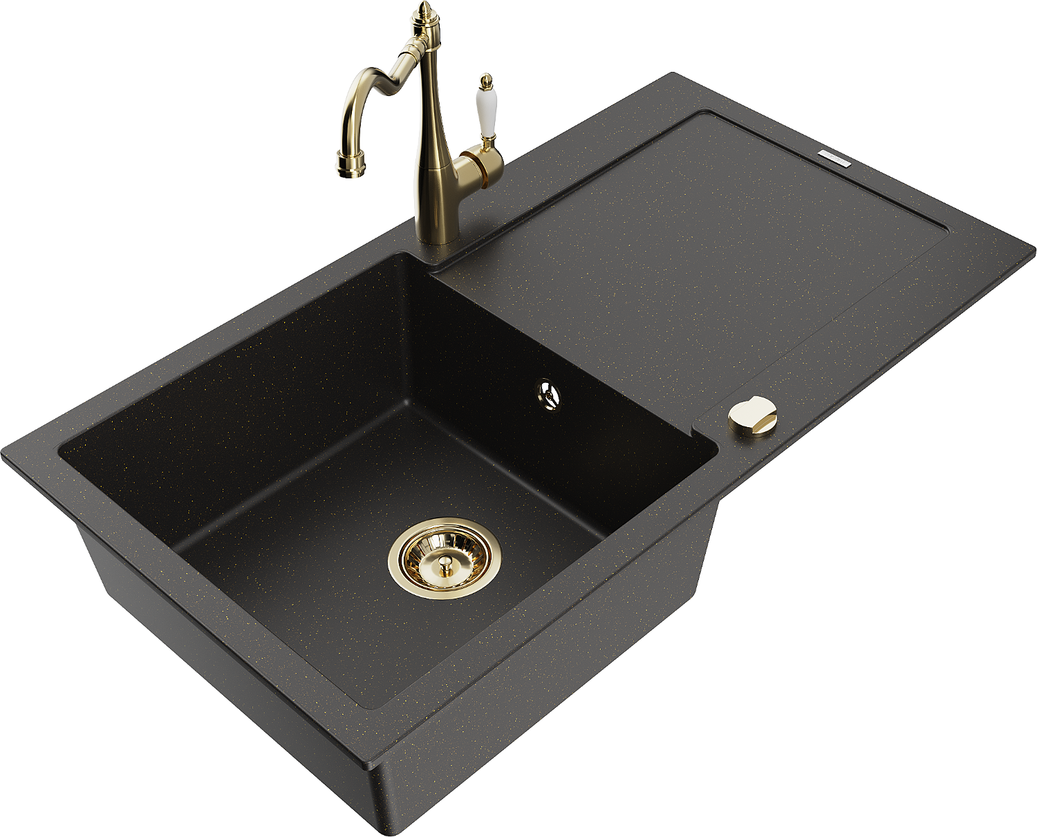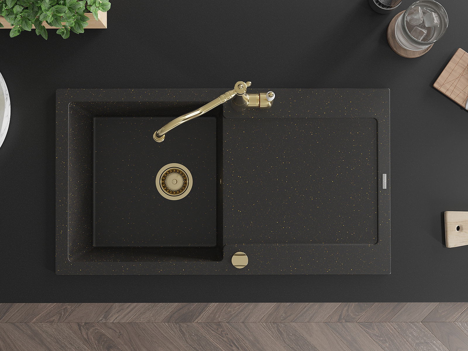 Mexen Leo granite kitchen sink with 1 bowl, drainer and Carla kitchen tap, black/gold metallic - 6501-75-670700-50