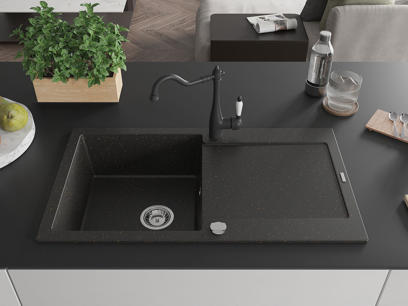 The sink is made of high quality granite. It is an elegant and, above all, practical complement to every kitchen, regardless of its style. High quality and granite durability ensure many years of use.