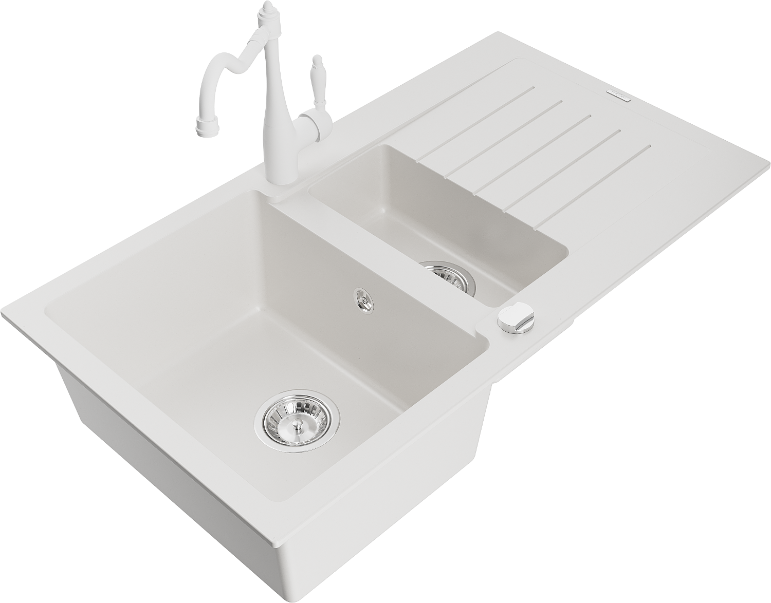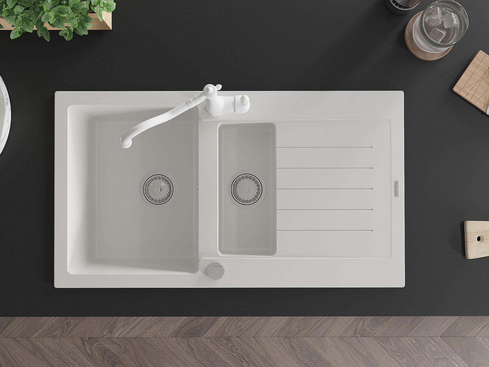 Mexen Matias granite sink 1.5-bowl with drainer and Carla kitchen tap, white - 6502-20-670700-20