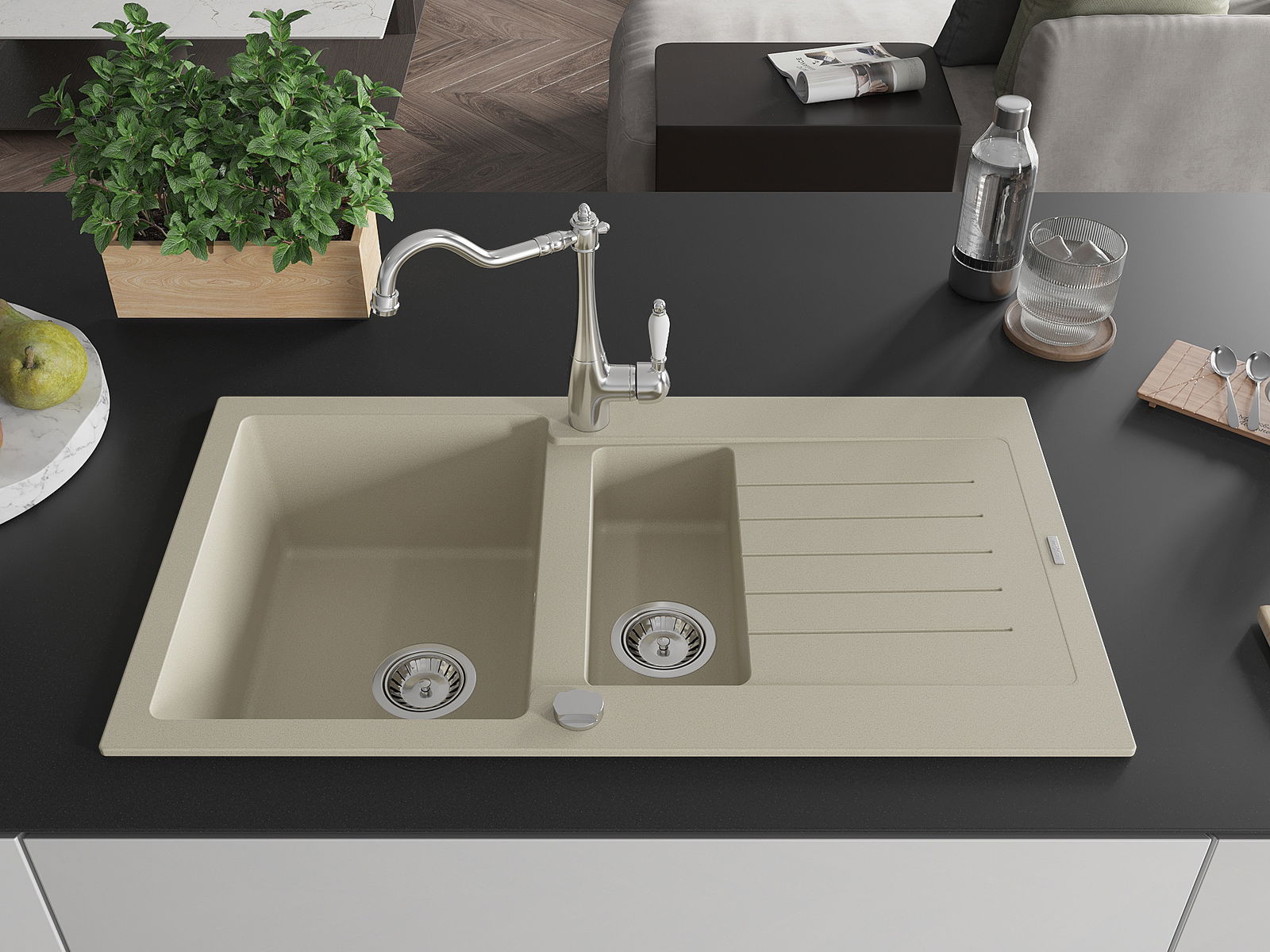 The sink is made of high quality granite. It is an elegant and, above all, practical complement to every kitchen, regardless of its style. High quality and granite durability ensure many years of use.
