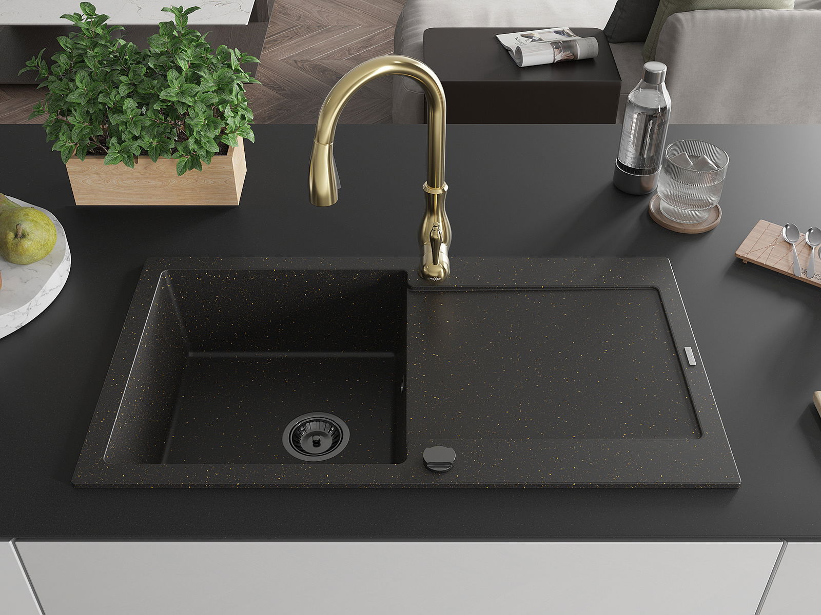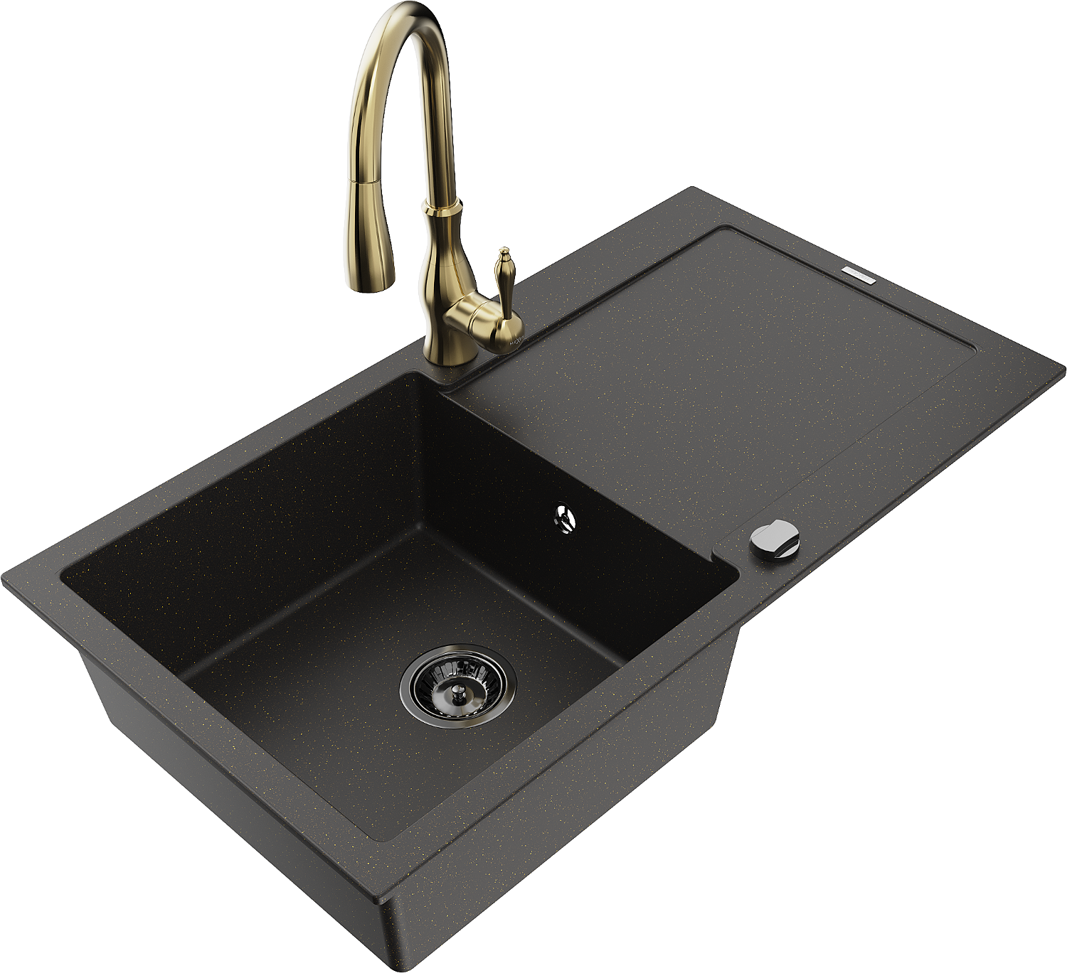 Mexen Leo granite sink 1-bowl with drainer and Savita kitchen tap, black/gold metallic - 6501-75-672601-50-B