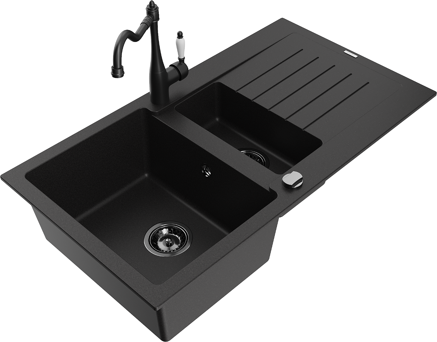 Mexen Matias granite sink 1.5-bowl with drainer and Carla kitchen tap, black - 6502-77-670700-70-B