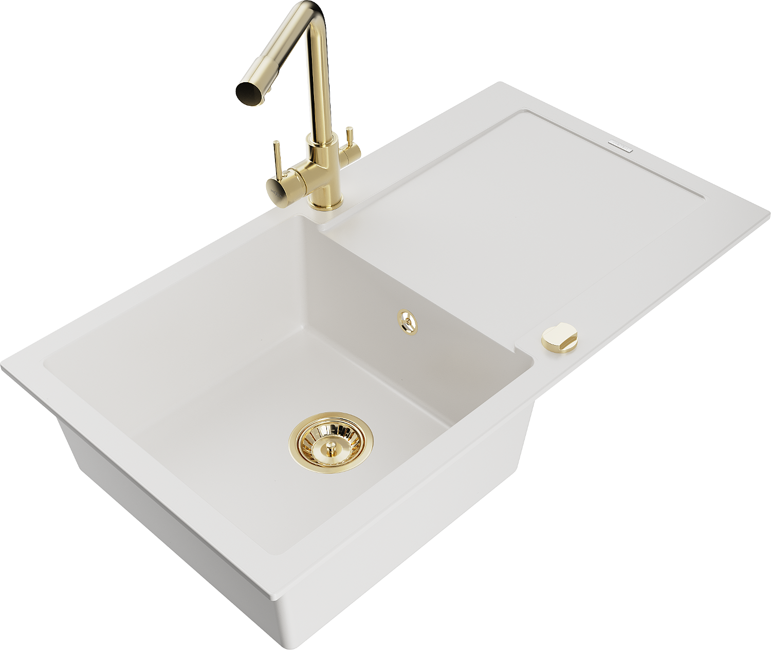 Mexen Leo granite sink with 1 bowl, draining board, and Duero kitchen tap, white - 6501-20-671600-50