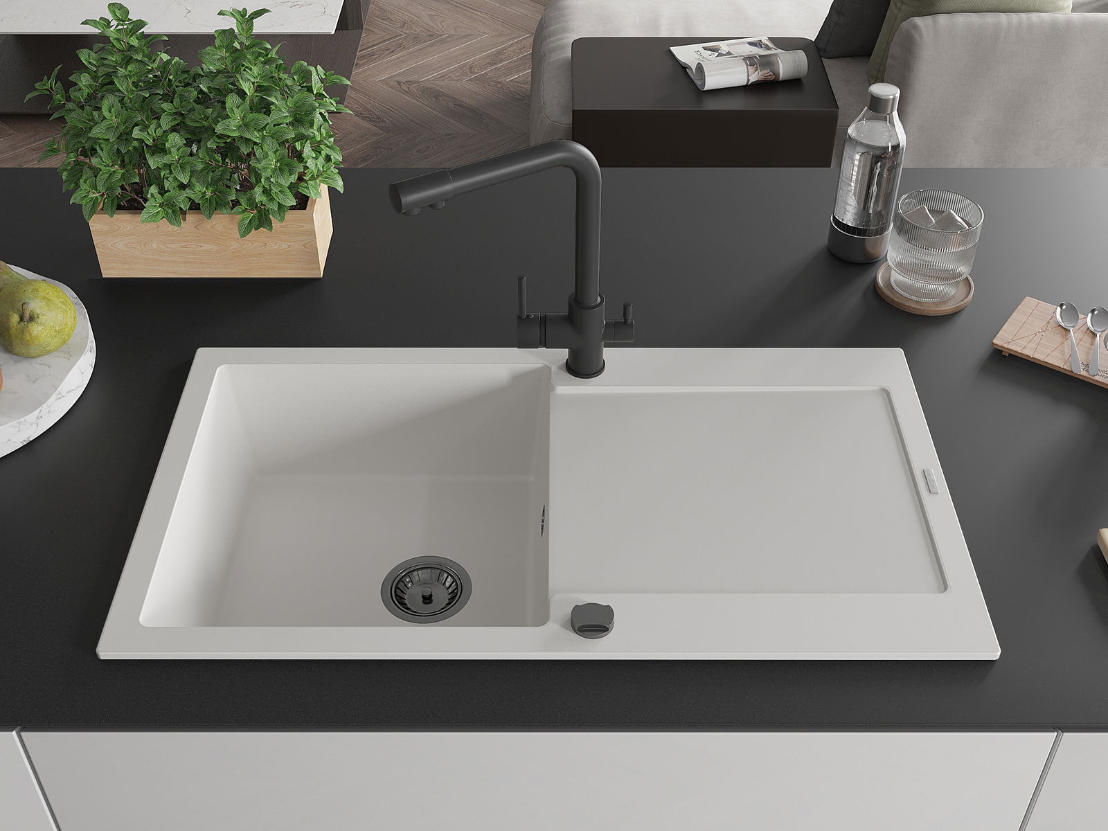 The sink is made of high quality granite. It is an elegant and, above all, practical complement to every kitchen, regardless of its style. High quality and granite durability ensure many years of use.