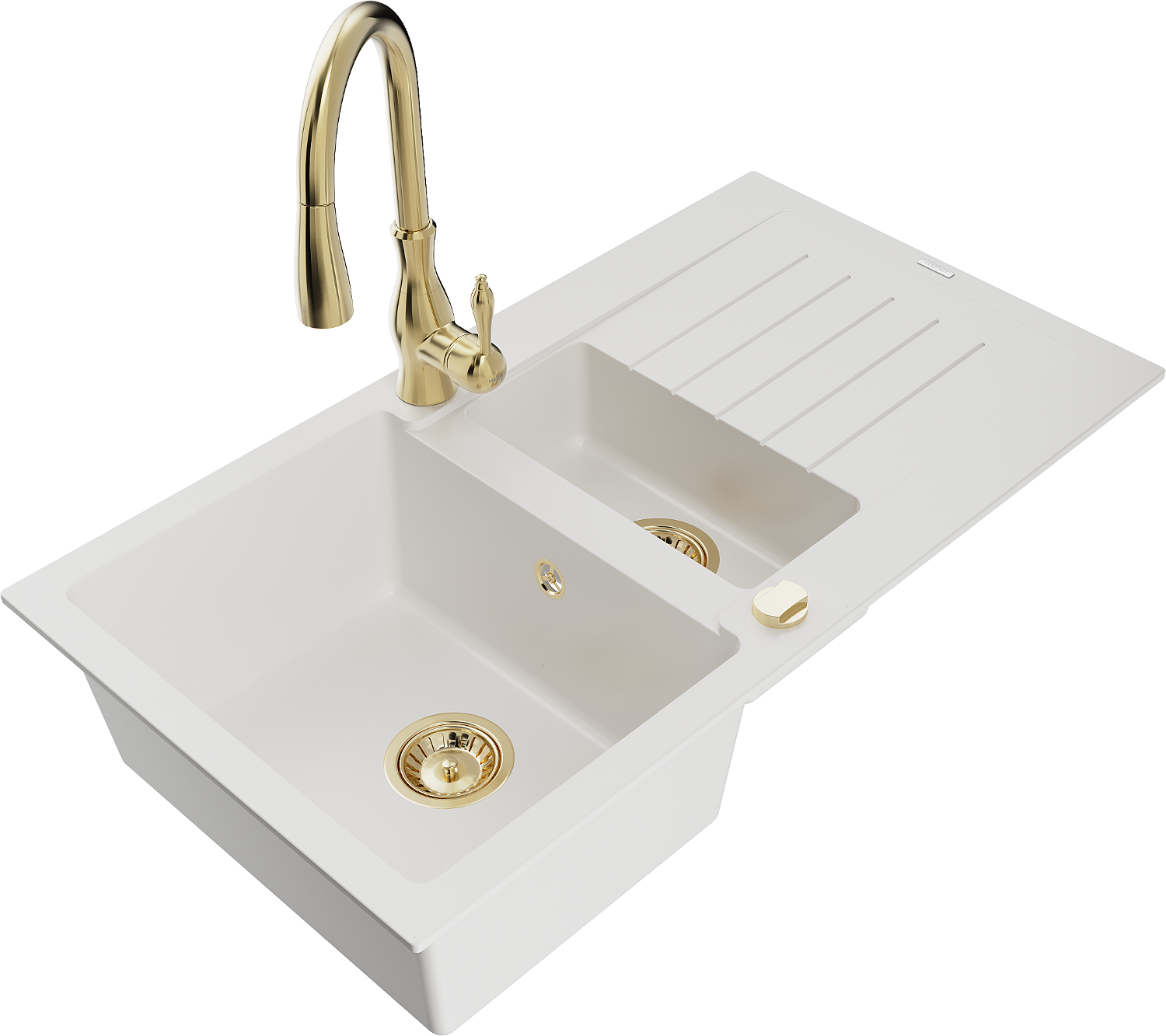 Mexen Matias granite sink 1.5-bowl with drainer and Savita kitchen tap, white - 6502-20-672601-50