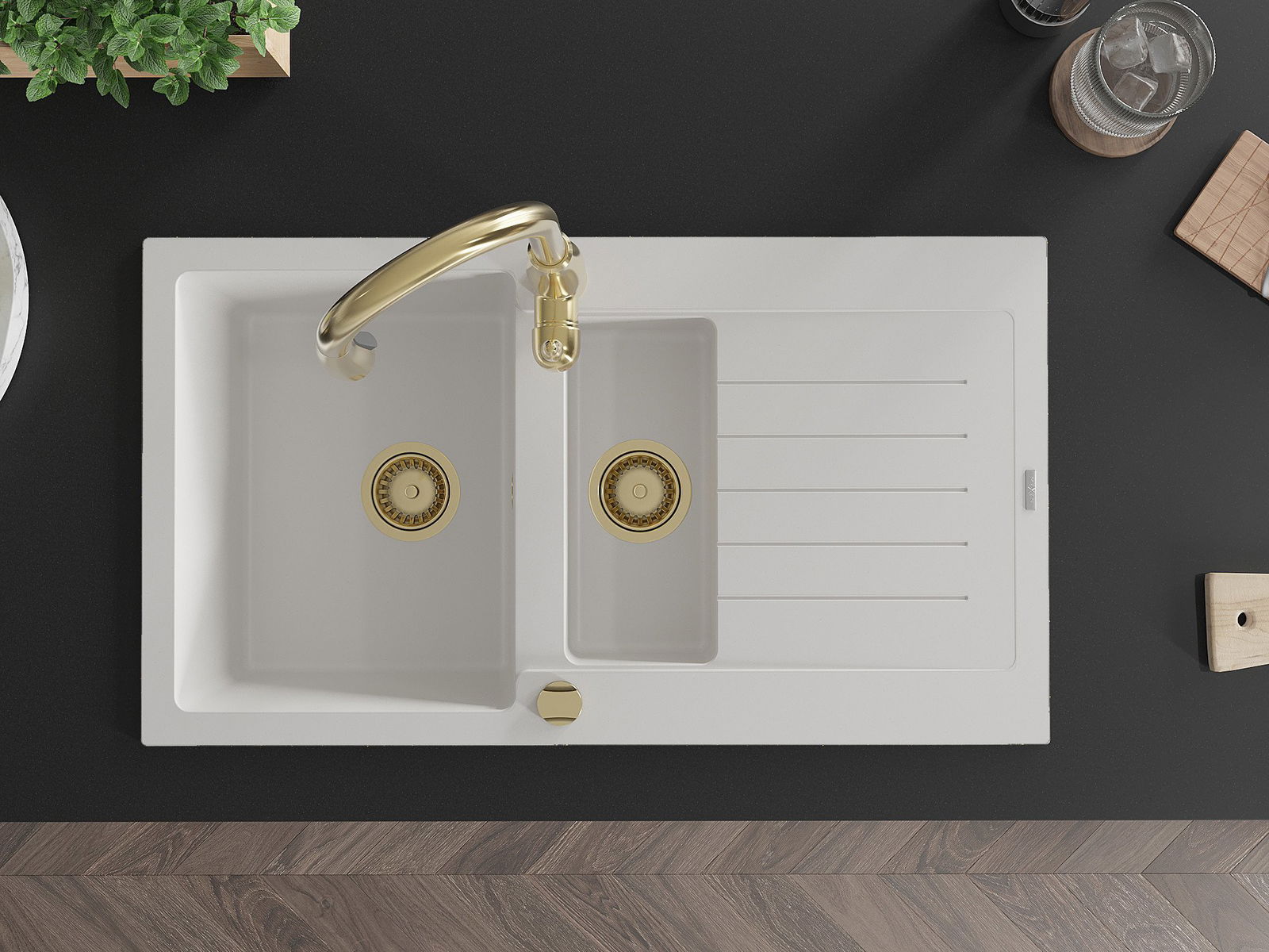 The sink has 2 linked holes with a diameter of 35 mm, for self -burst. They can be used, among others For mounting a liquid dispenser that will eliminate the presence of plastic bottles in the kitchen and give it an elegant finish.