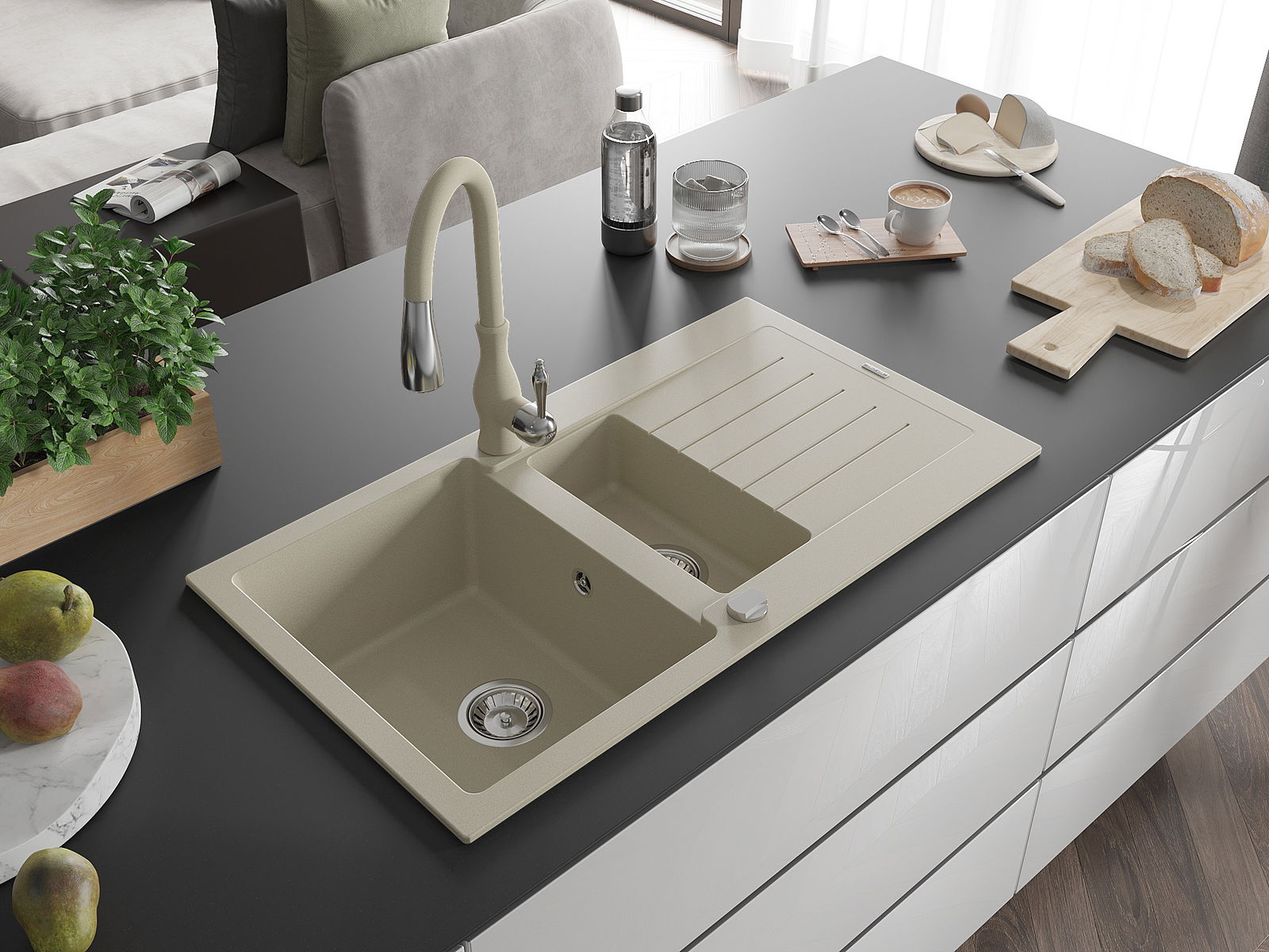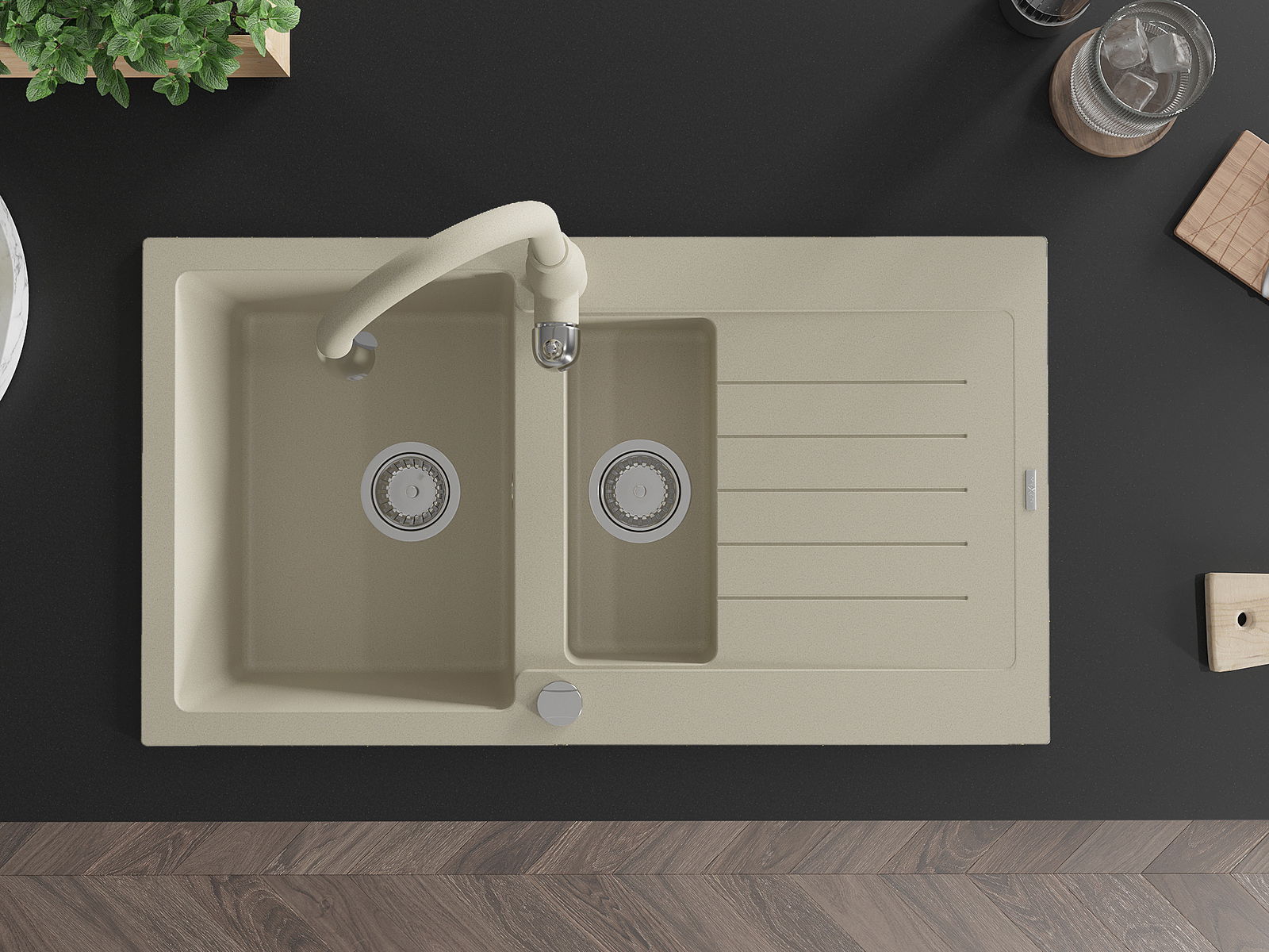 The sink is made of high quality granite. It is an elegant and, above all, practical complement to every kitchen, regardless of its style. High quality and granite durability ensure many years of use.