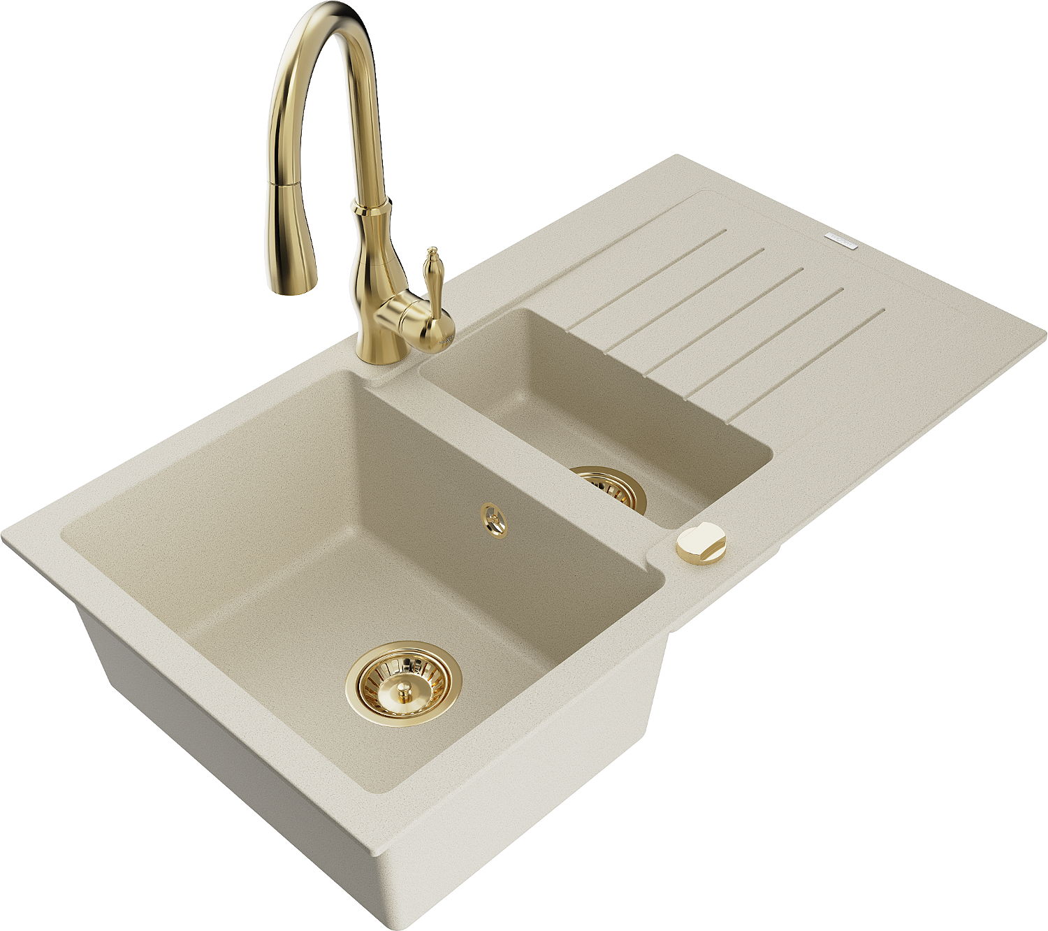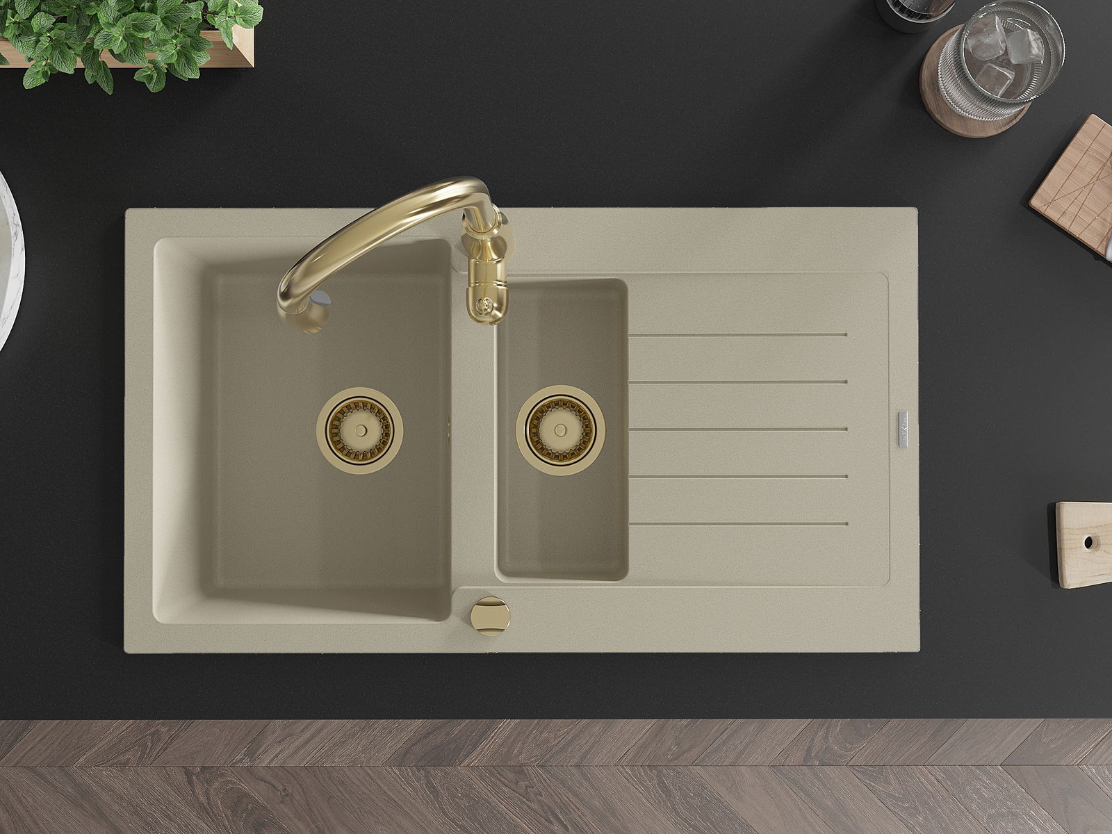 Mexen Matias granite sink 1.5-bowl with drainer and Savita kitchen tap, beige - 6502-69-672601-50