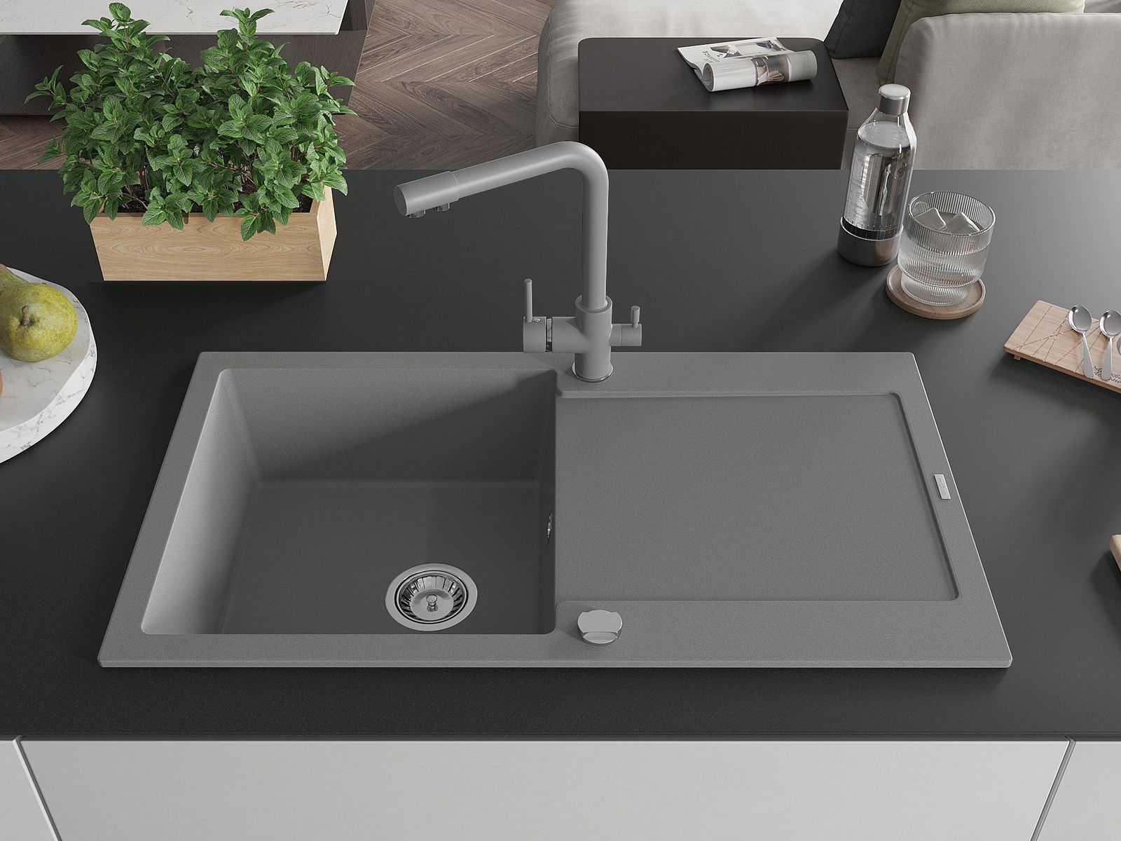 The sink is made of high quality granite. It is an elegant and, above all, practical complement to every kitchen, regardless of its style. High quality and granite durability ensure many years of use.