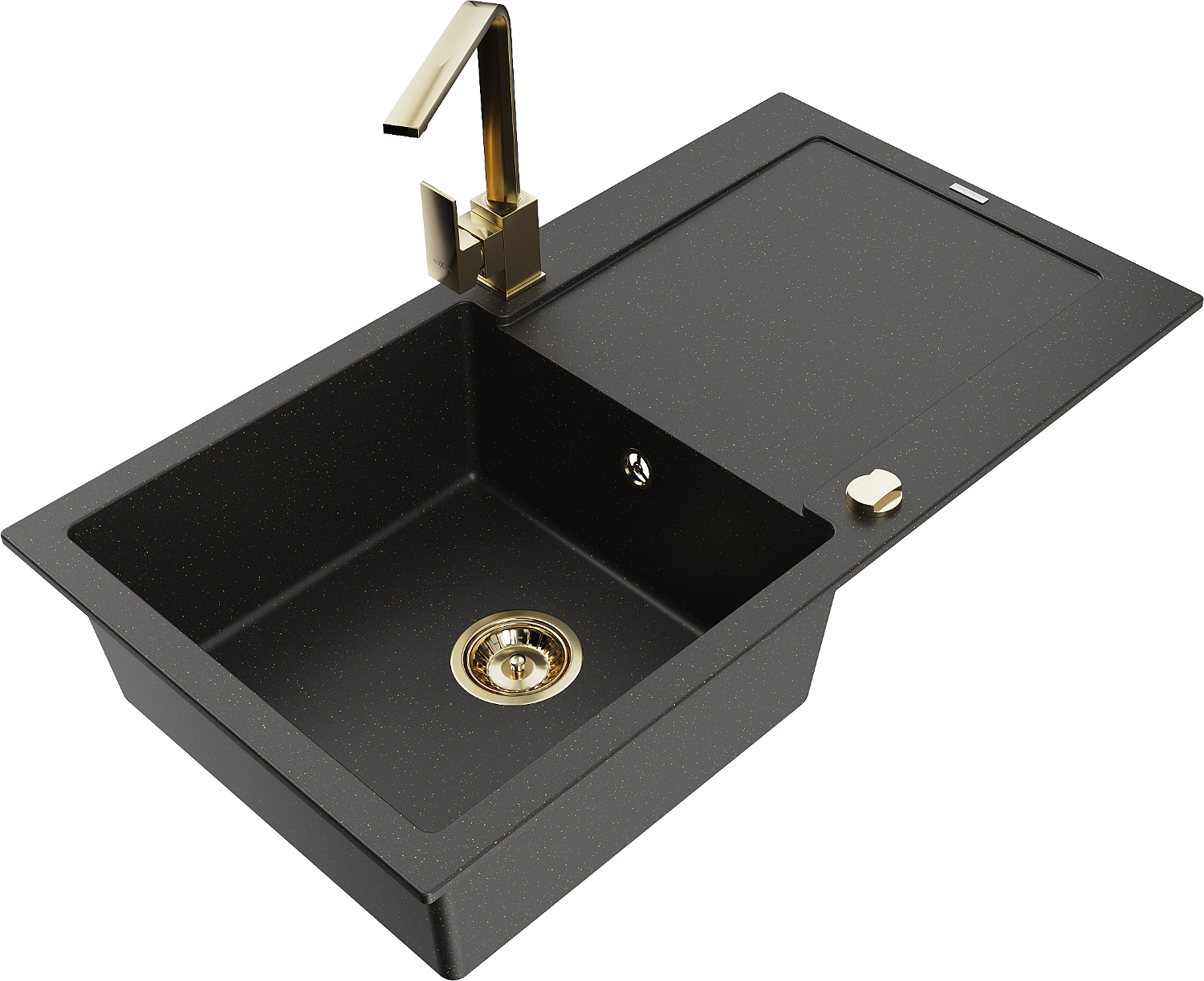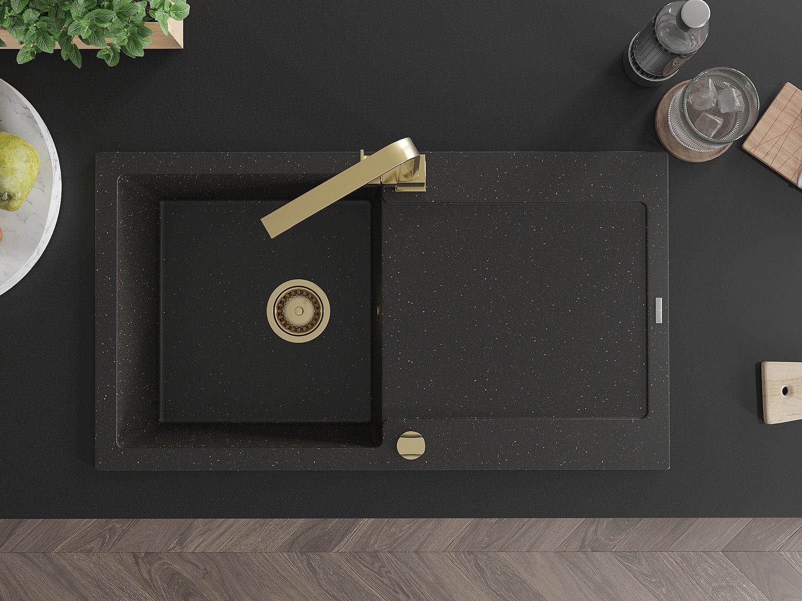 Mexen Leo Granite Kitchen Sink 1-bowl with Drainer and Rita Kitchen Tap, Black/Gold Metallic - 6501-75-670300-50