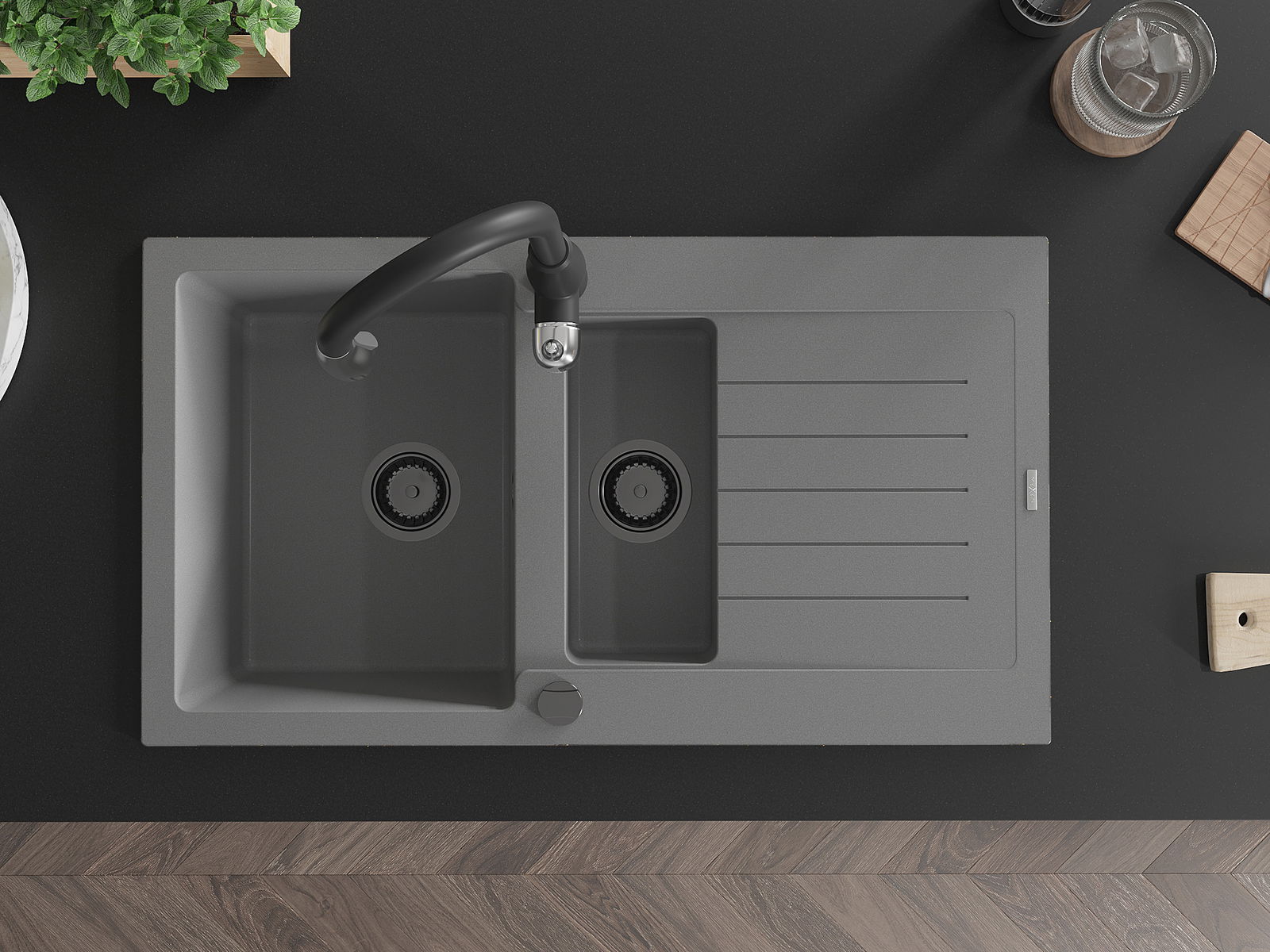 Mexen Matias granite sink 1.5-bowl with drainer and Savita kitchen tap, grey - 6502-71-672601-70-B
