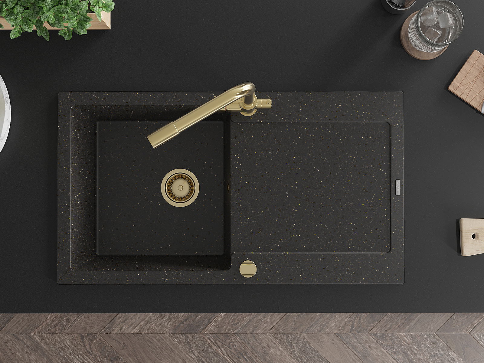 Mexen Leo granite sink 1-bowl with drainer and Duero kitchen tap, black/gold metallic - 6501-75-671600-50