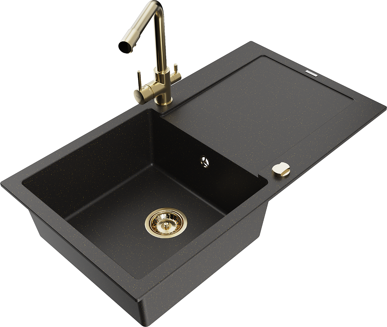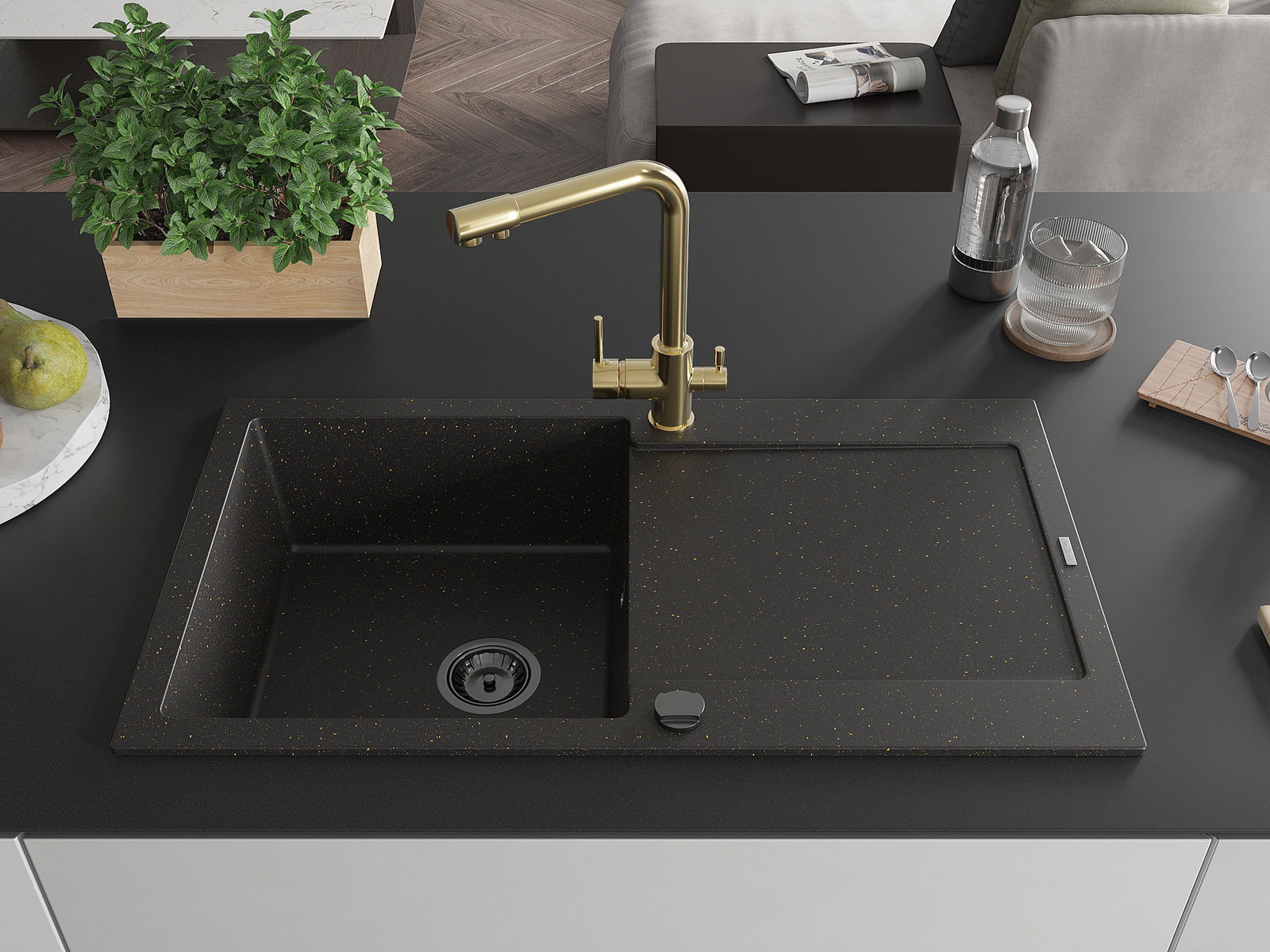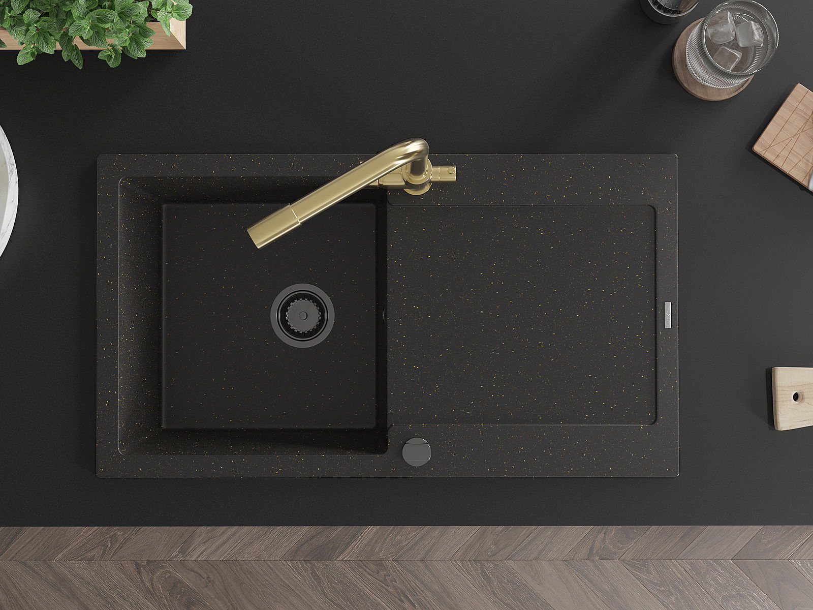 Mexen Leo granite sink 1-bowl with drainer and Duero kitchen tap, black/gold metallic - 6501-75-671600-50-B