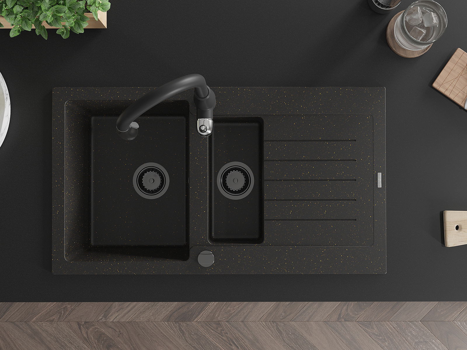 Mexen Matias granite sink 1.5-bowl with drainer and Savita kitchen tap, black/gold - 6502-75-672601-70-B