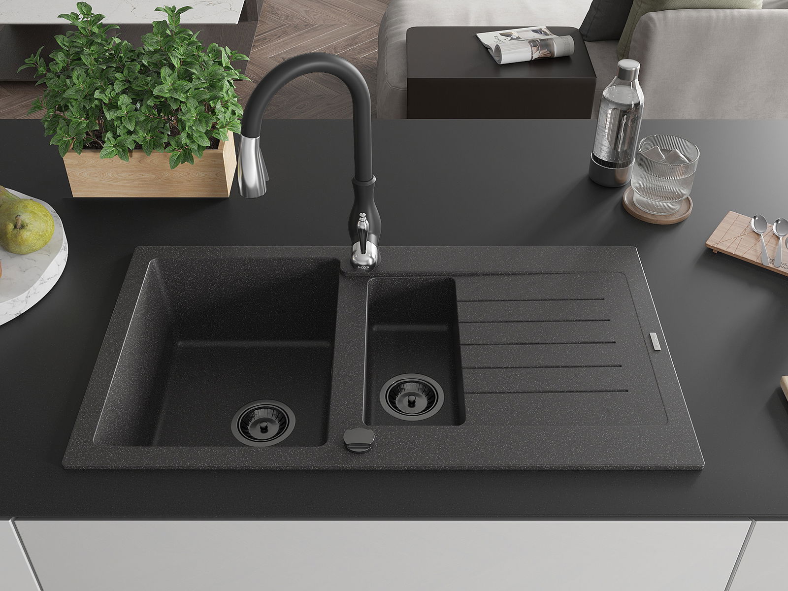 Mexen Matias Granite Sink 1.5-Bowl with Drainer and Savita Kitchen Tap, Speckled Black - 6502-76-672601-70-B