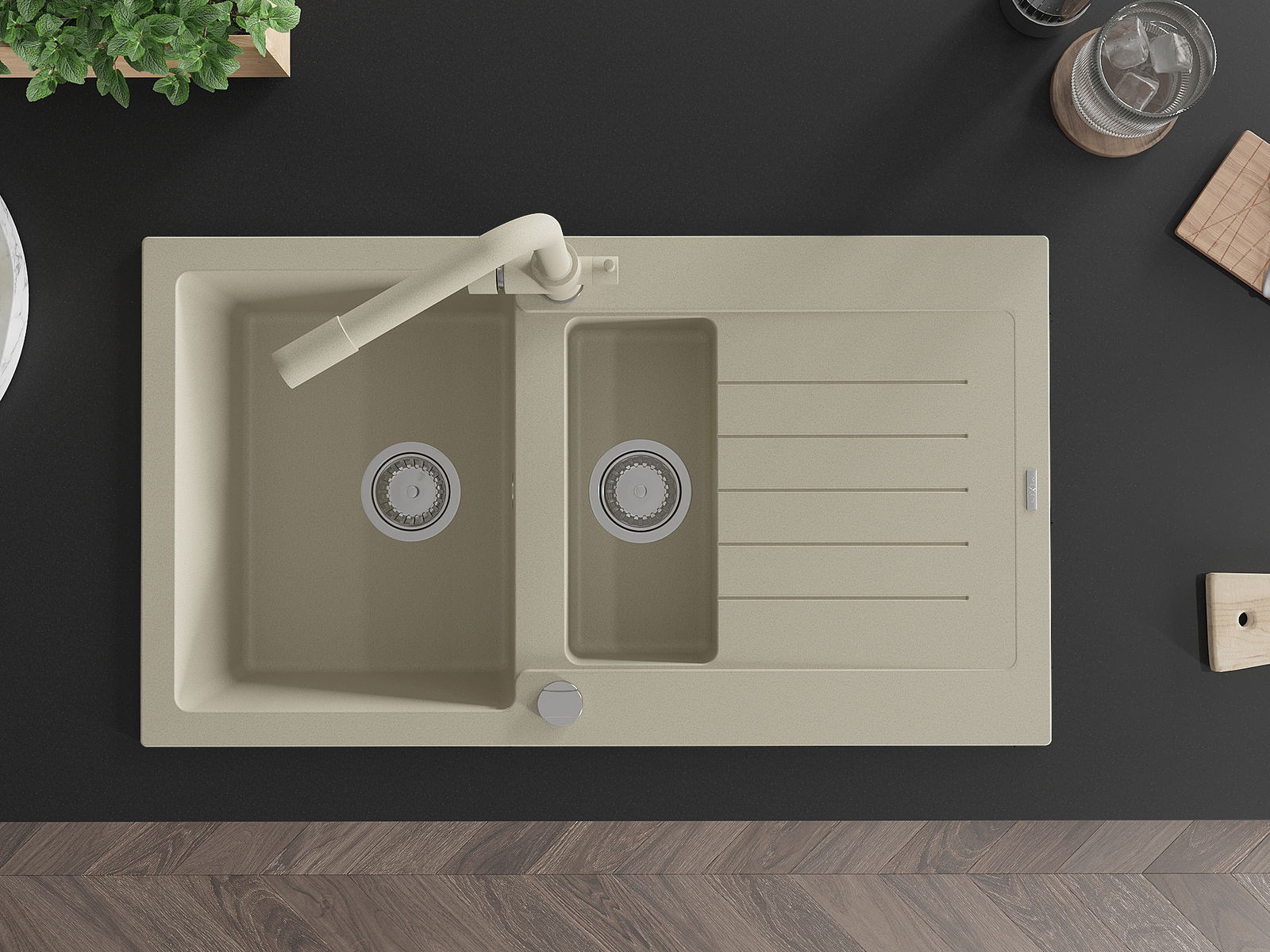 Mexen Matias granite sink 1.5-bowl with drainer and Duero kitchen tap, beige - 6502-69-671600-69