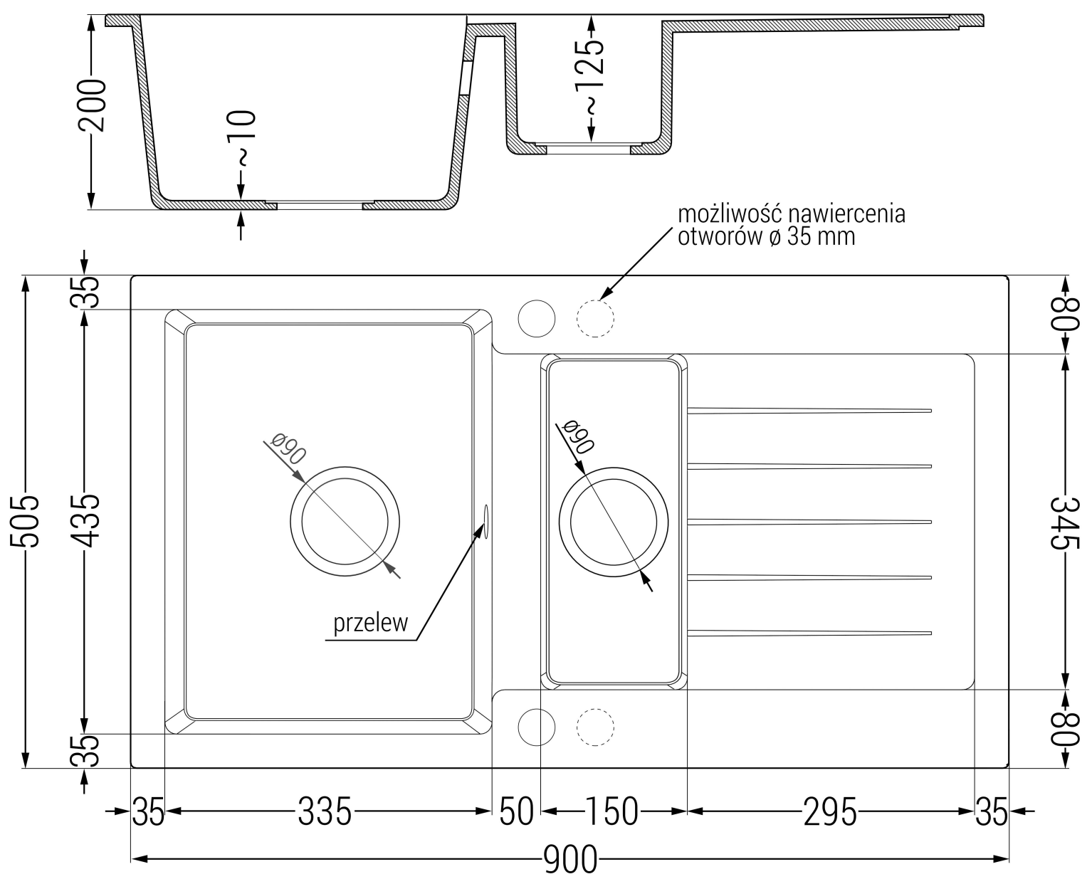 The sink has 2 pre-drilled holes with a diameter of 35 mm that can be knocked out independently. They can be used, for example, to install a soap dispenser, eliminating the need for plastic bottles in the kitchen and giving it an elegant finish.