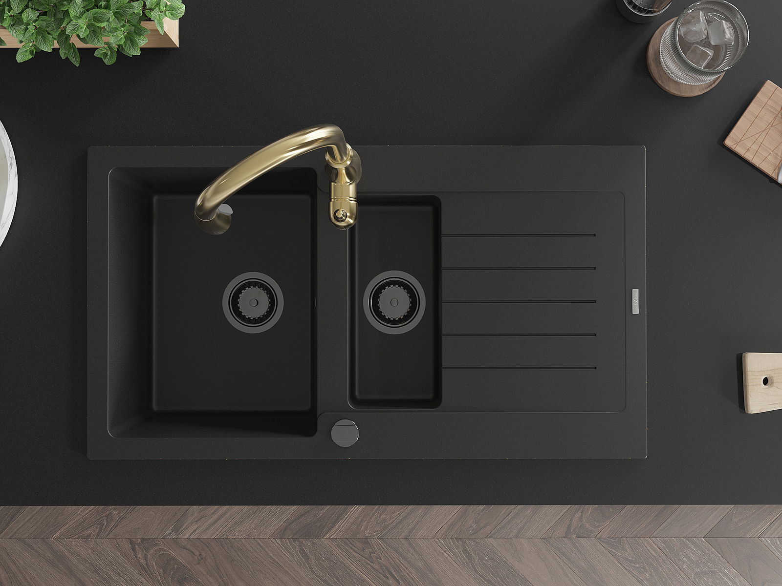Mexen Matias granite sink 1.5-bowl with drainer and Savita kitchen tap, black - 6502-77-672601-50-B