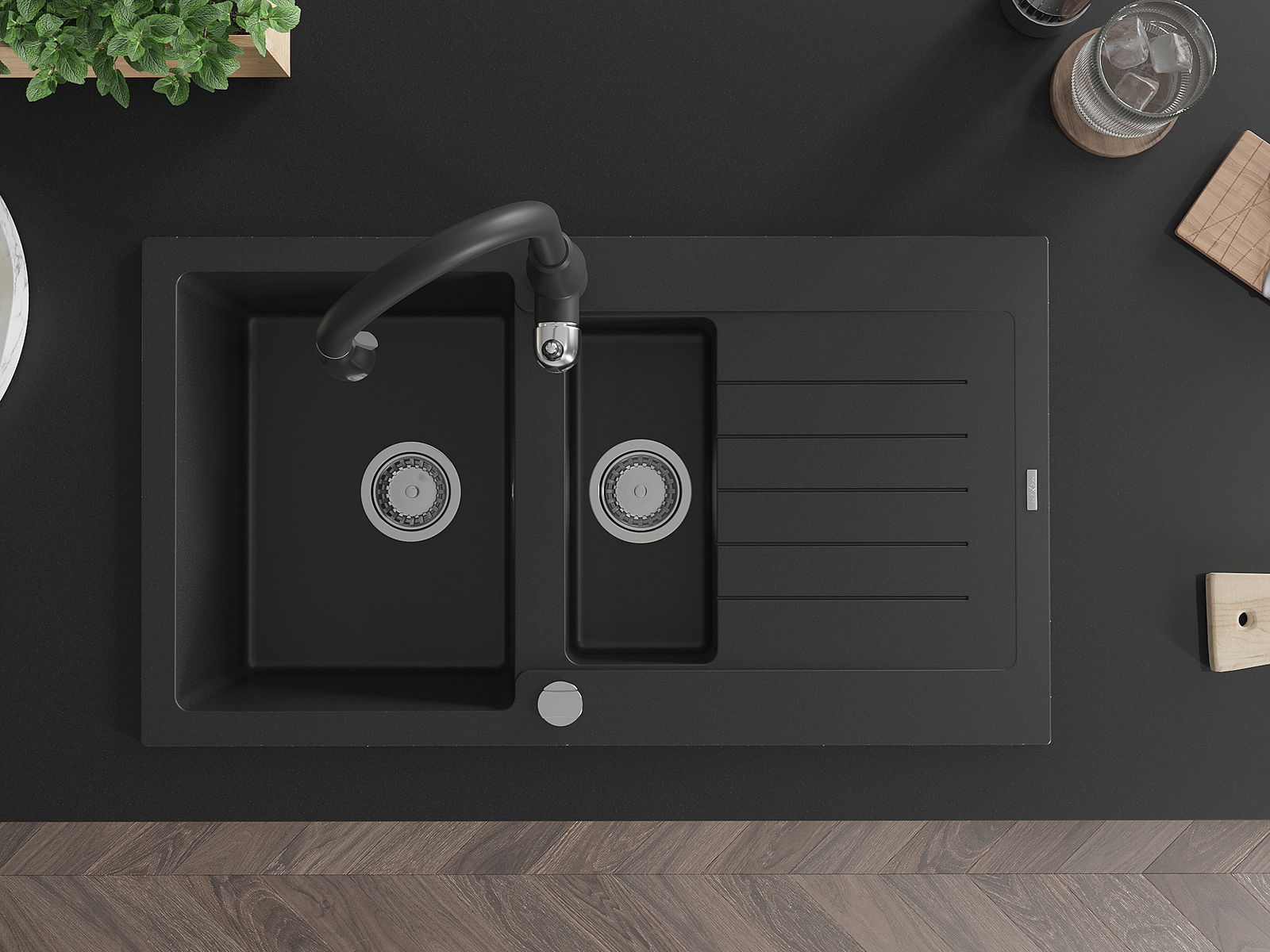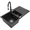 Mexen Matias granite sink 1.5-bowl with drainer and Savita kitchen tap, black - 6502-77-672601-70