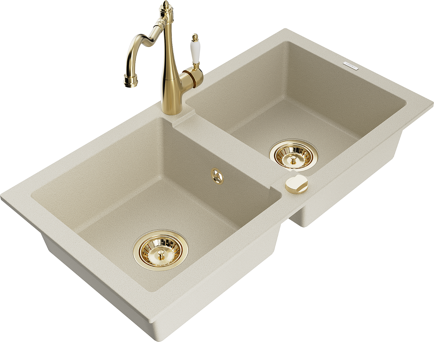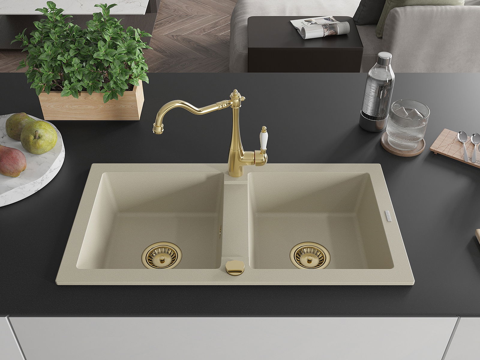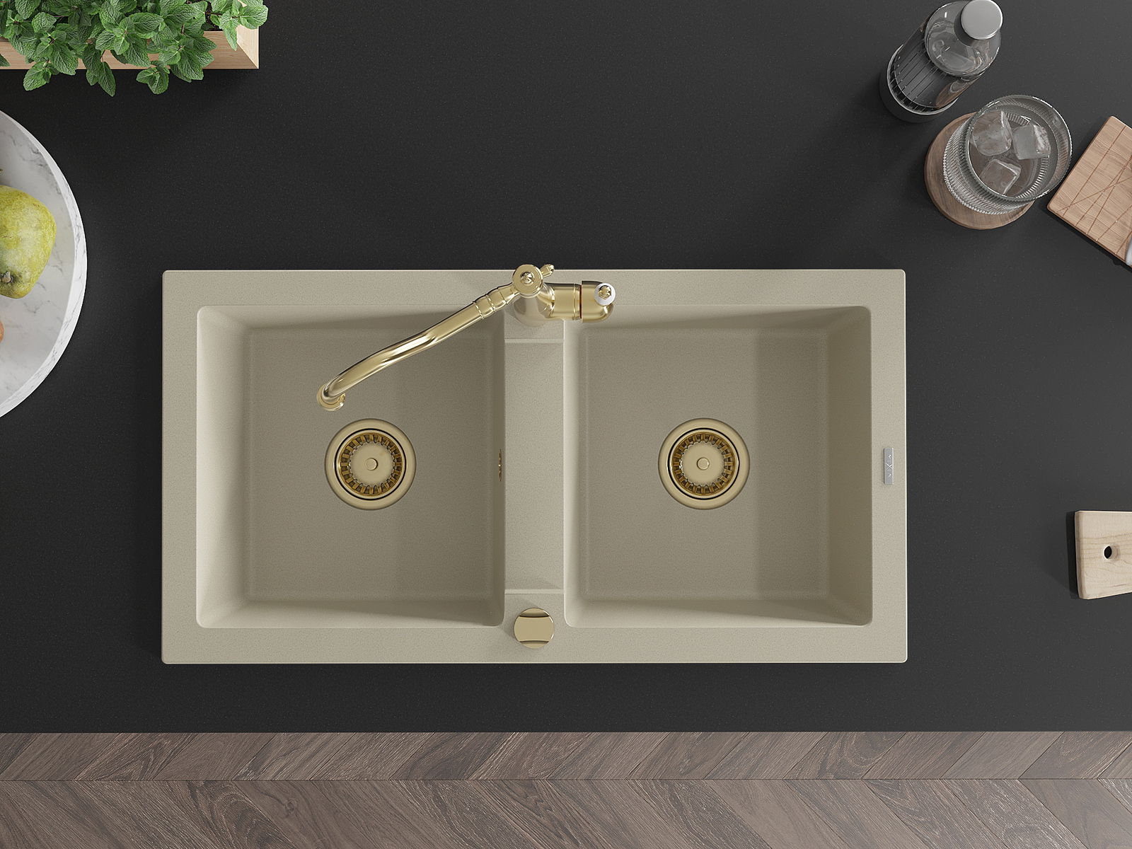 Mexen Mario granite sink 2-chamber with Carla kitchen tap, beige - 6504-69-670700-50