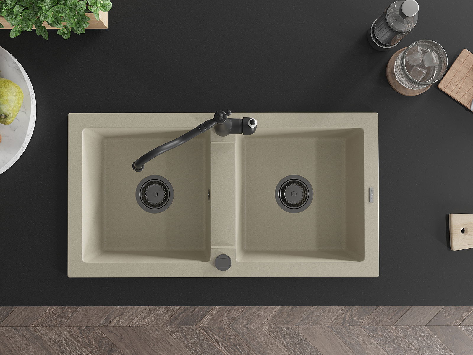 Mexen Mario granite sink 2-bowl with Carla kitchen tap, beige - 6504-69-670700-70