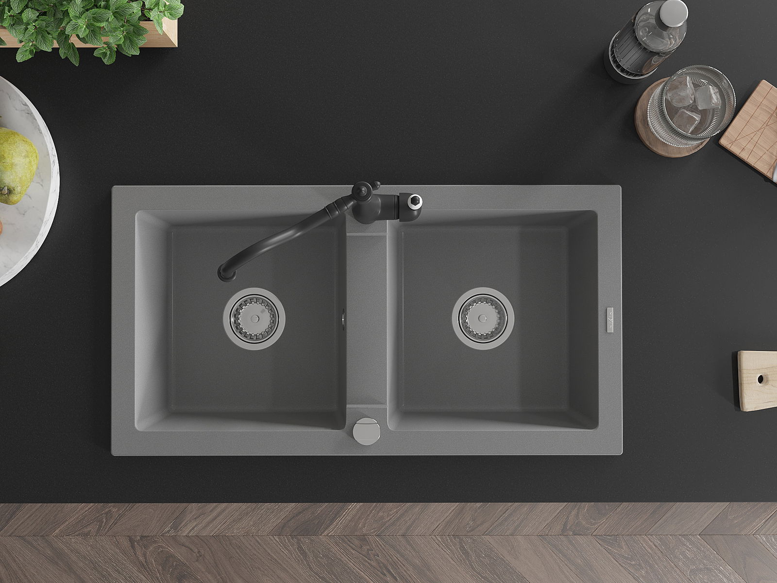 Mexen Mario granite sink 2-bowl with Carla kitchen tap, grey - 6504-71-670700-70