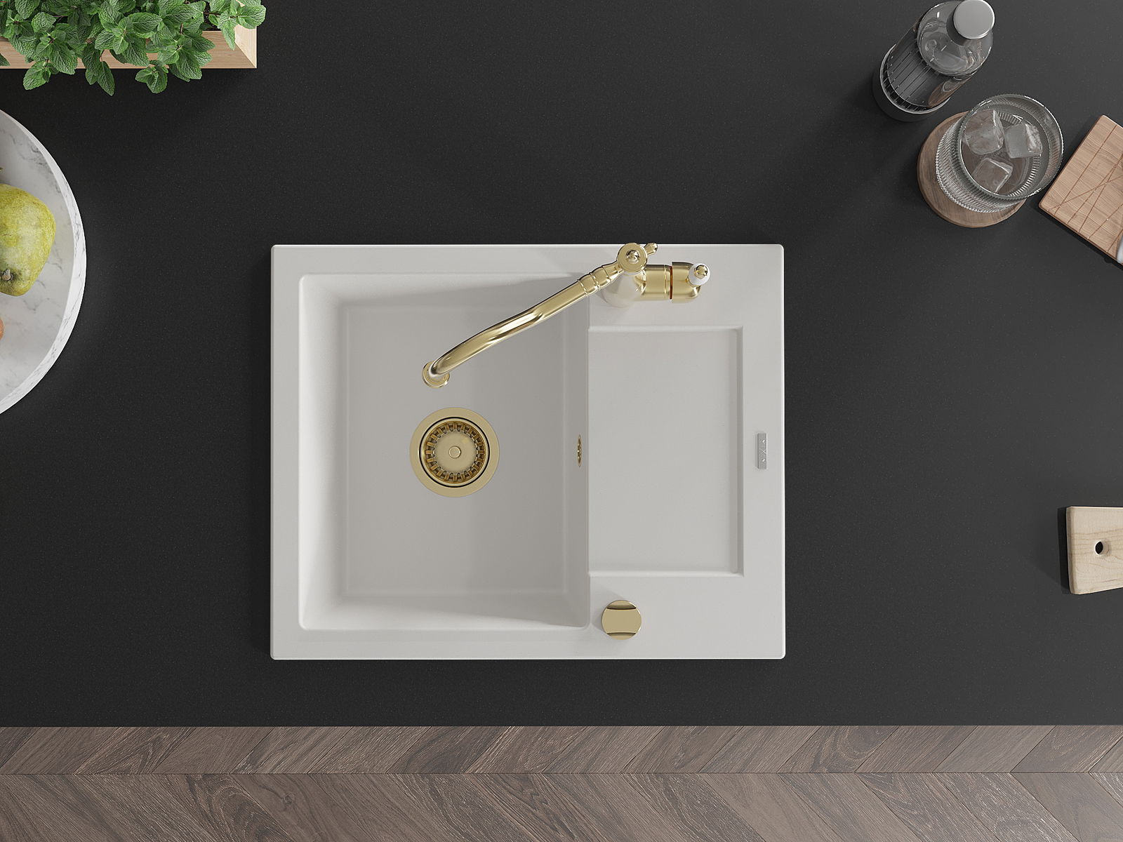 Mexen Enzo 1-bowl granite sink with drainer and Carla kitchen tap, white - 6506-20-670700-50