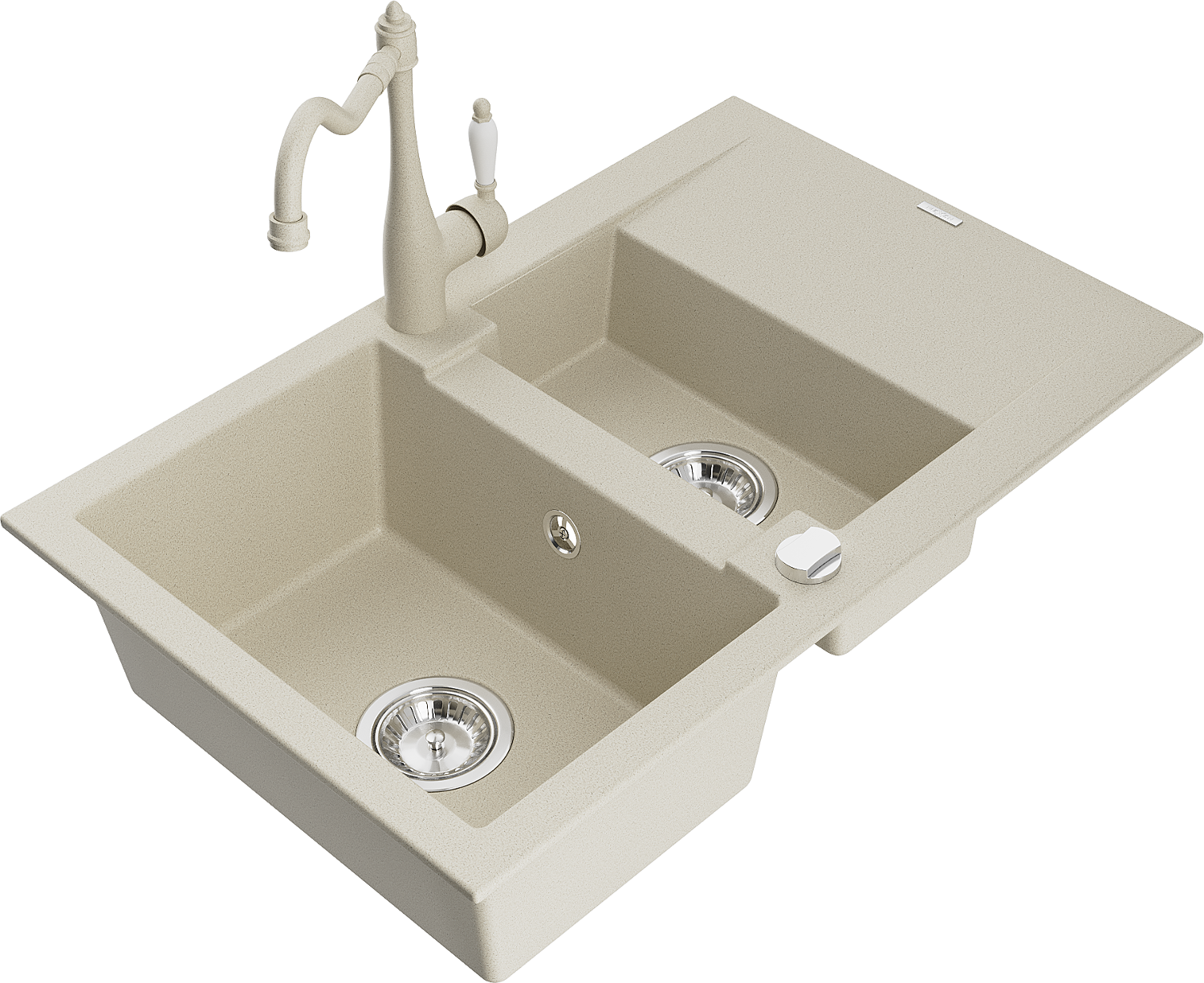 Mexen Gaspar 1.5-bowl granite sink with drainer and Carla kitchen tap, beige - 6507-69-670700-69