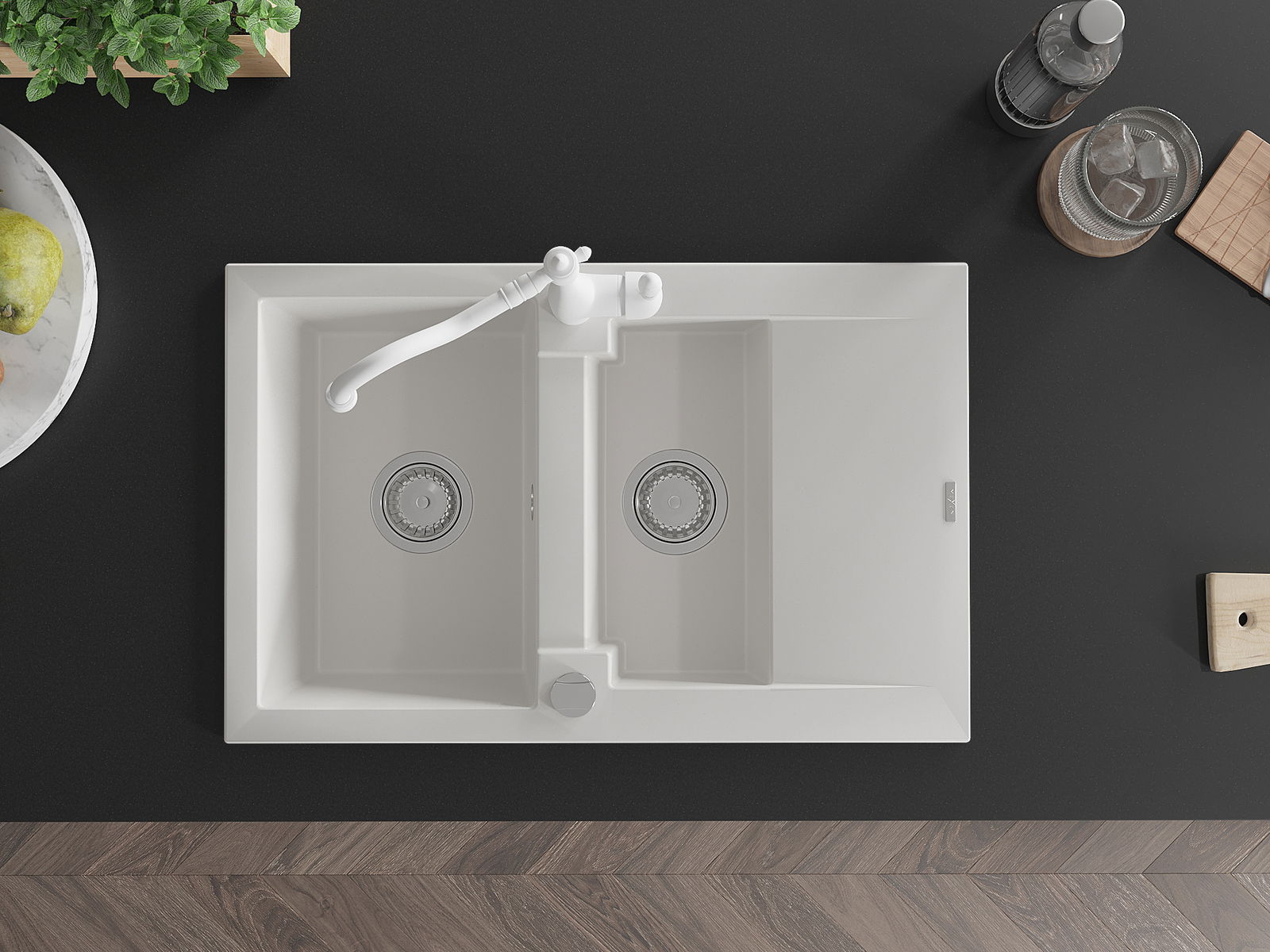 Mexen Pablo granite sink 1-bowl with drainer and Carla kitchen tap, white - 6510-20-670700-20